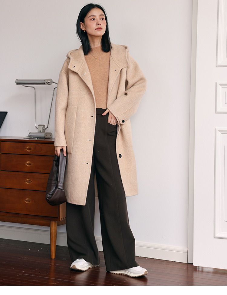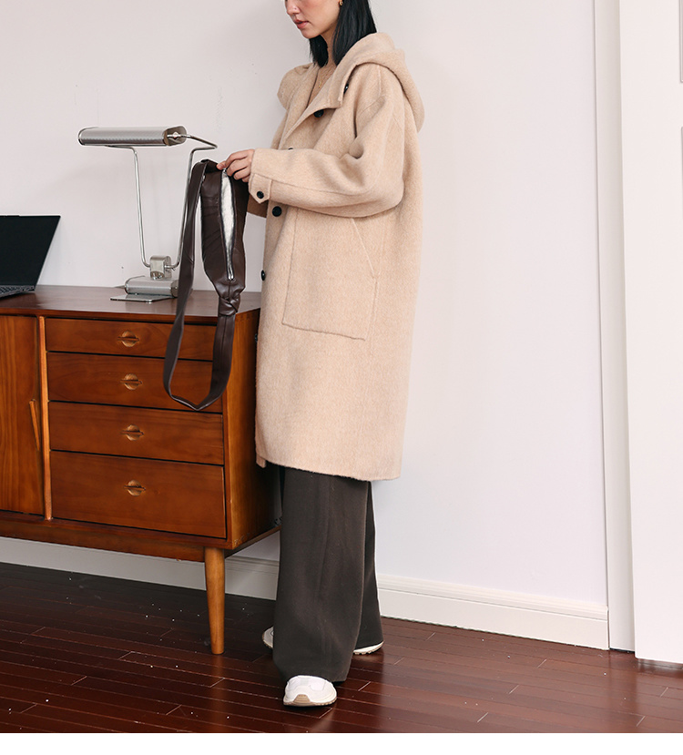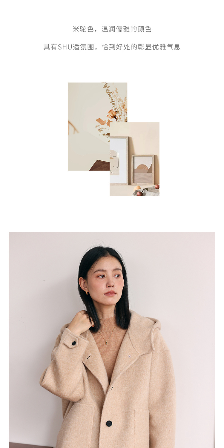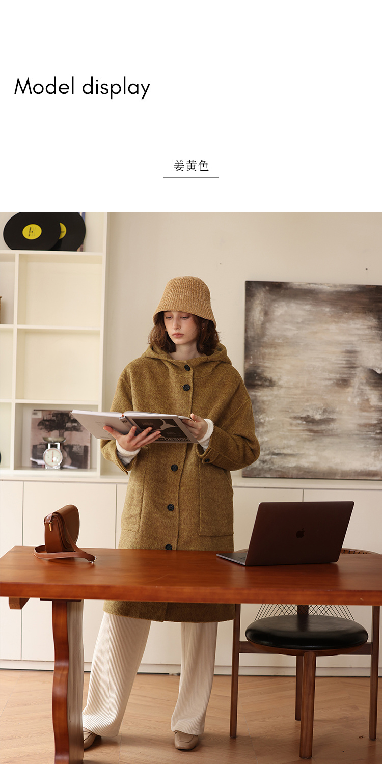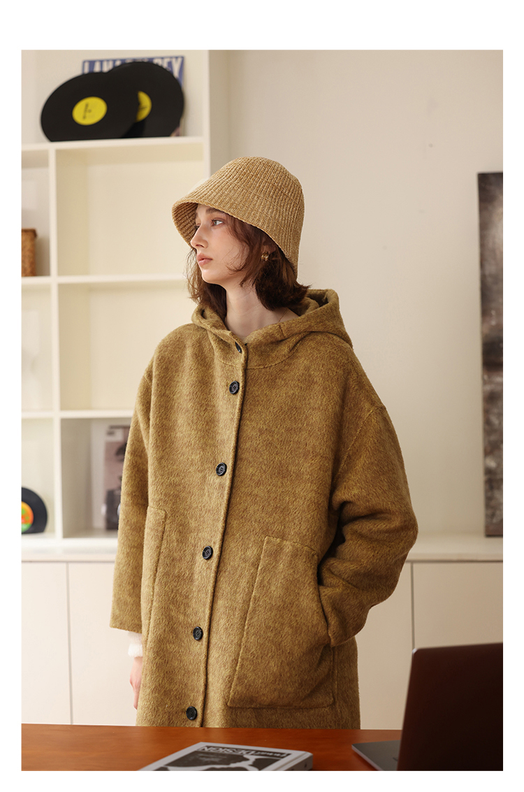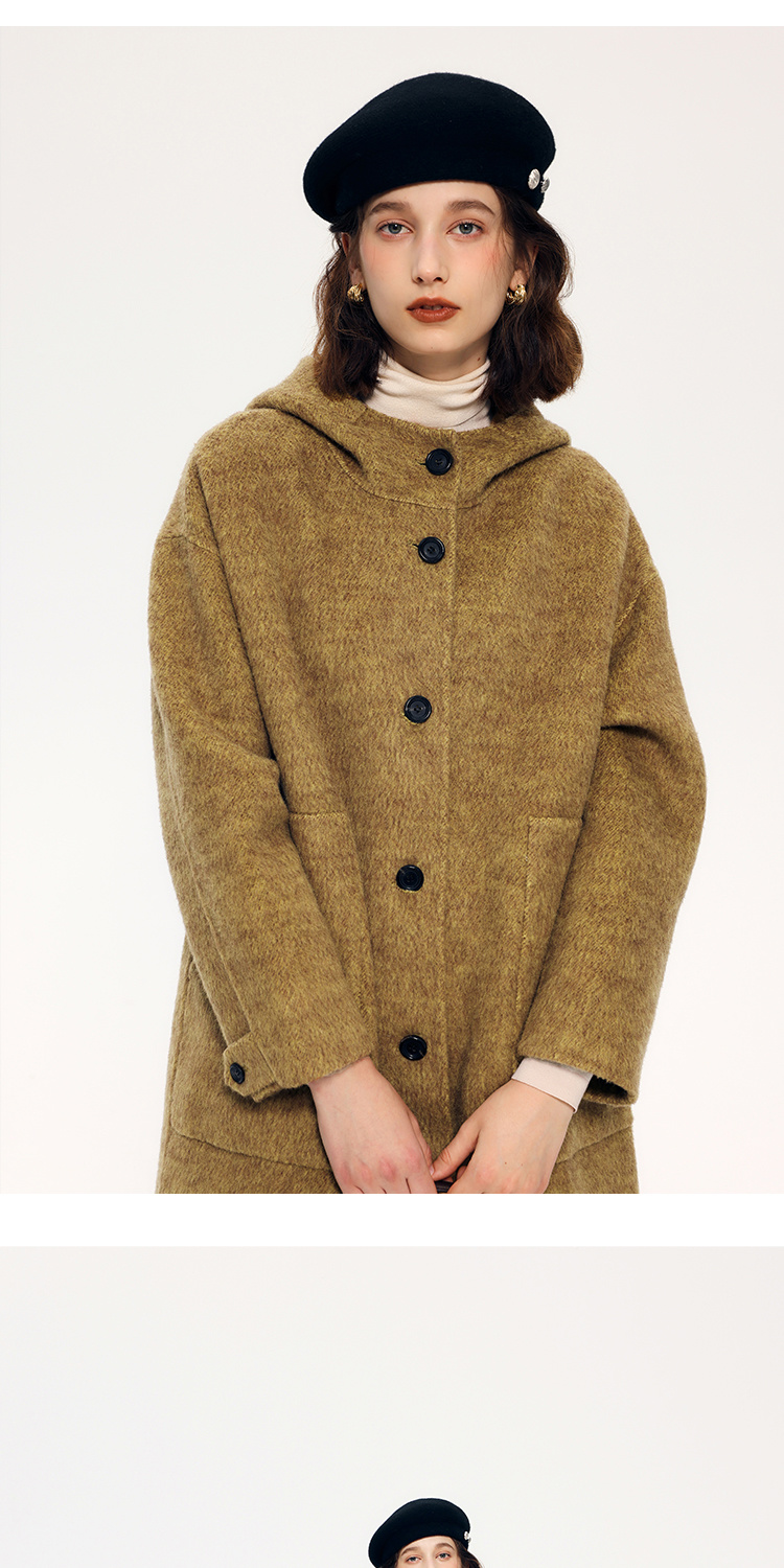 HeyDress连帽毛呢外套女秋冬宽松休闲羊毛长大衣骆驼绒气质双面呢