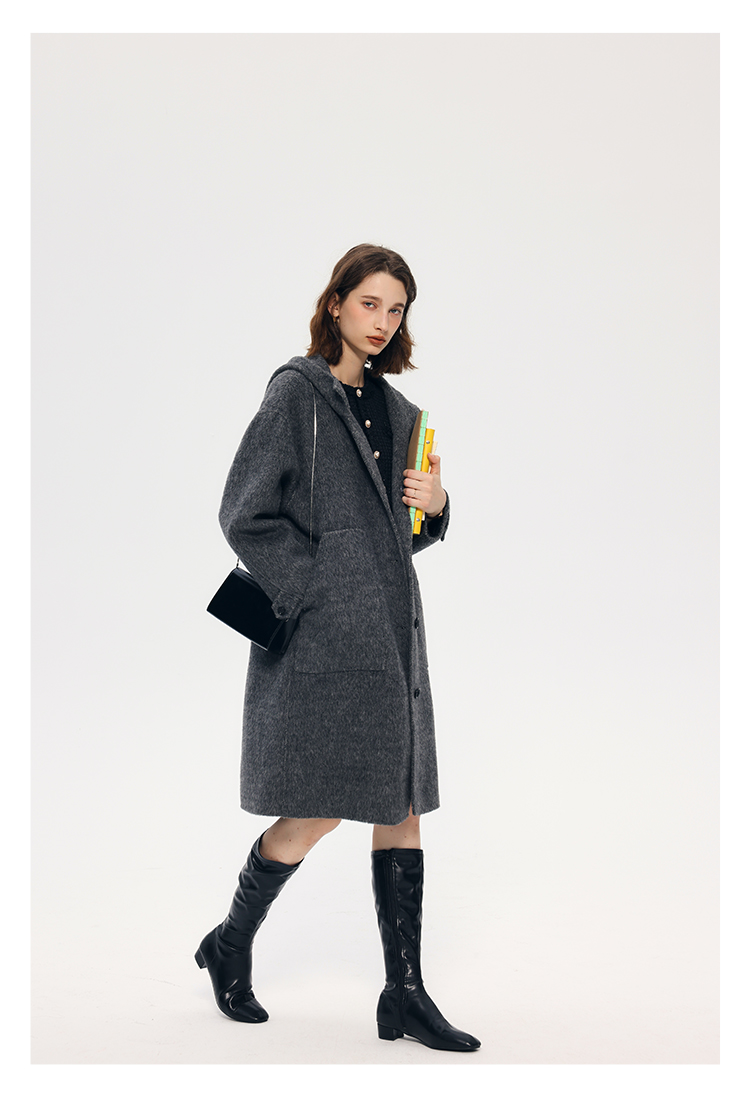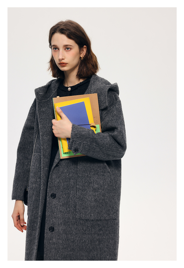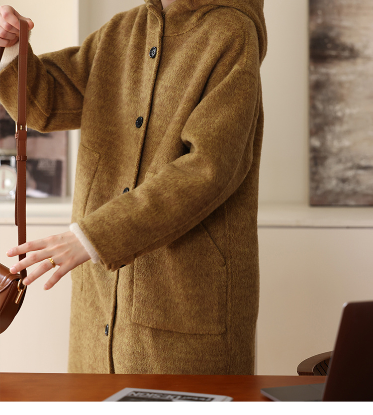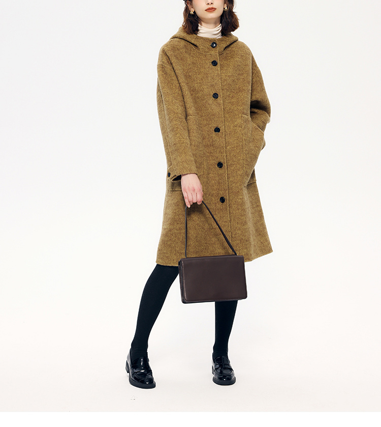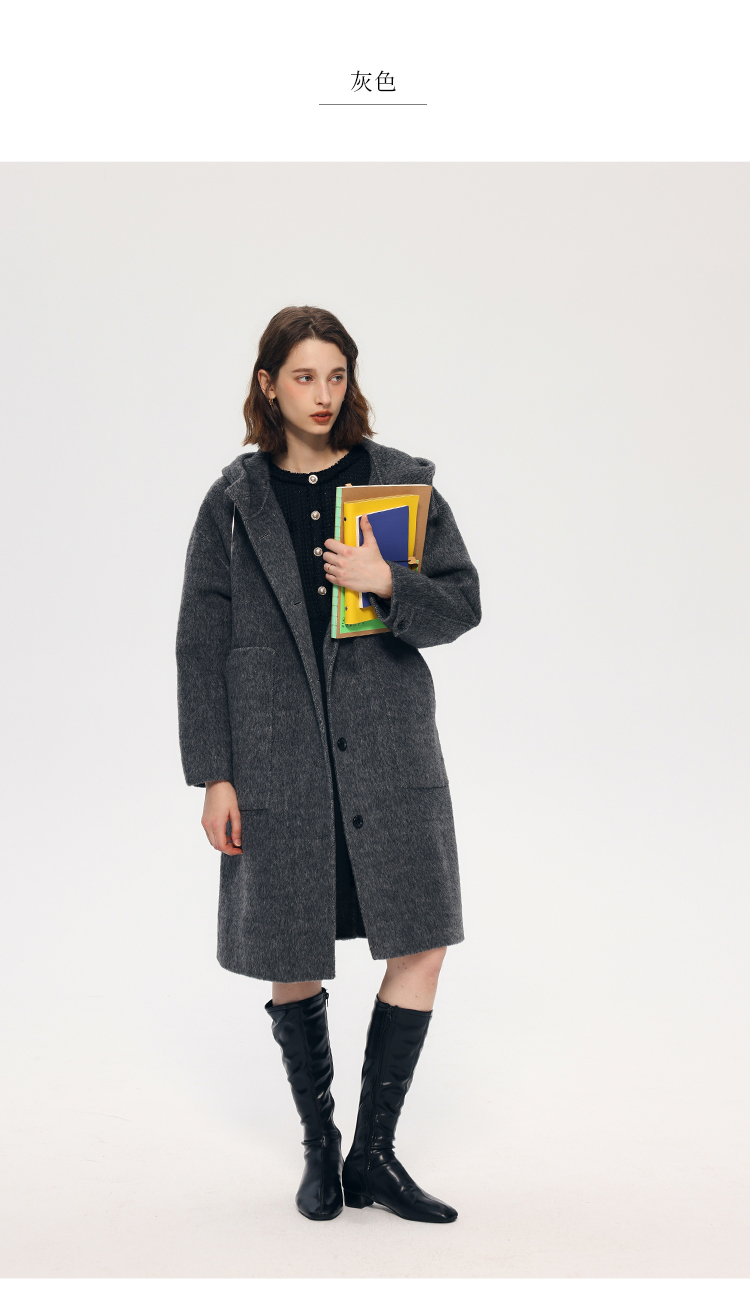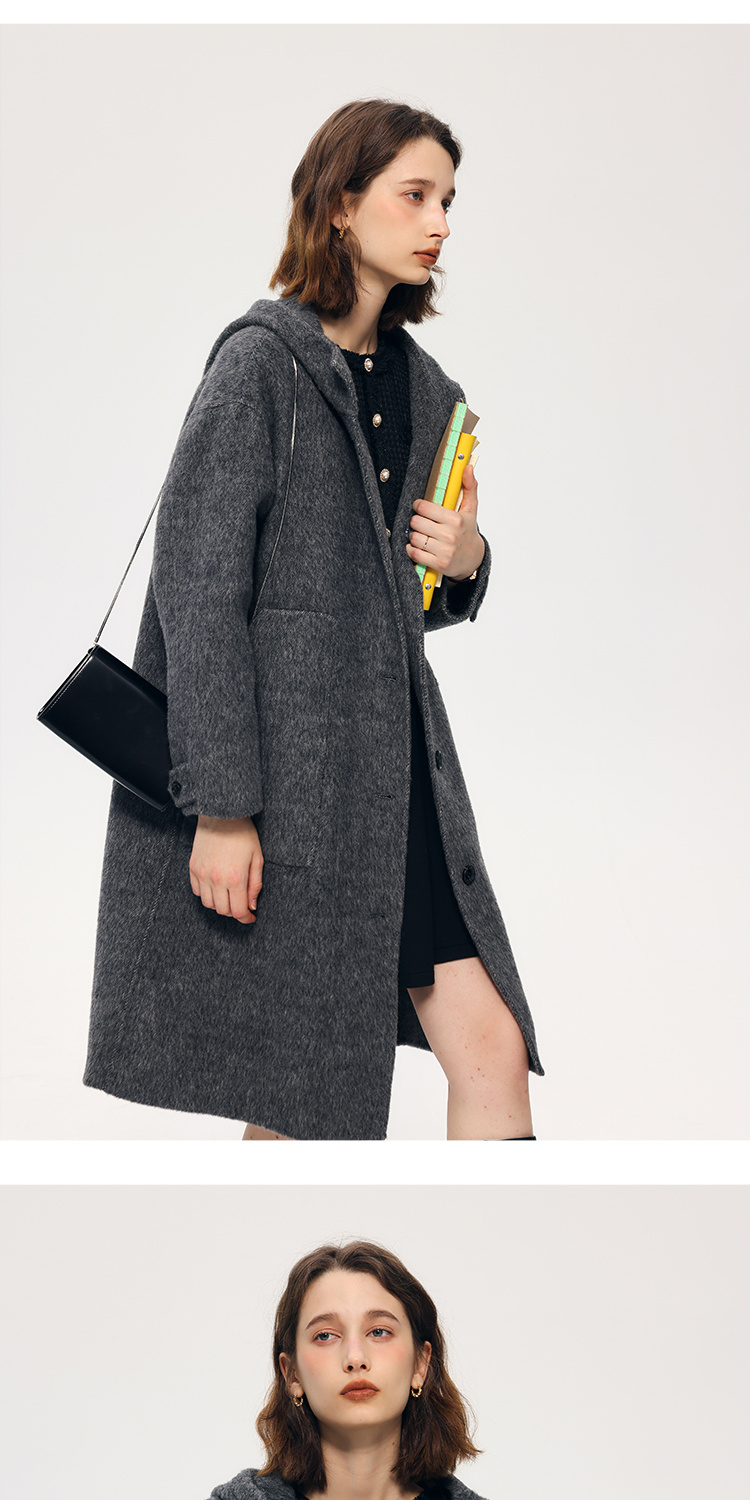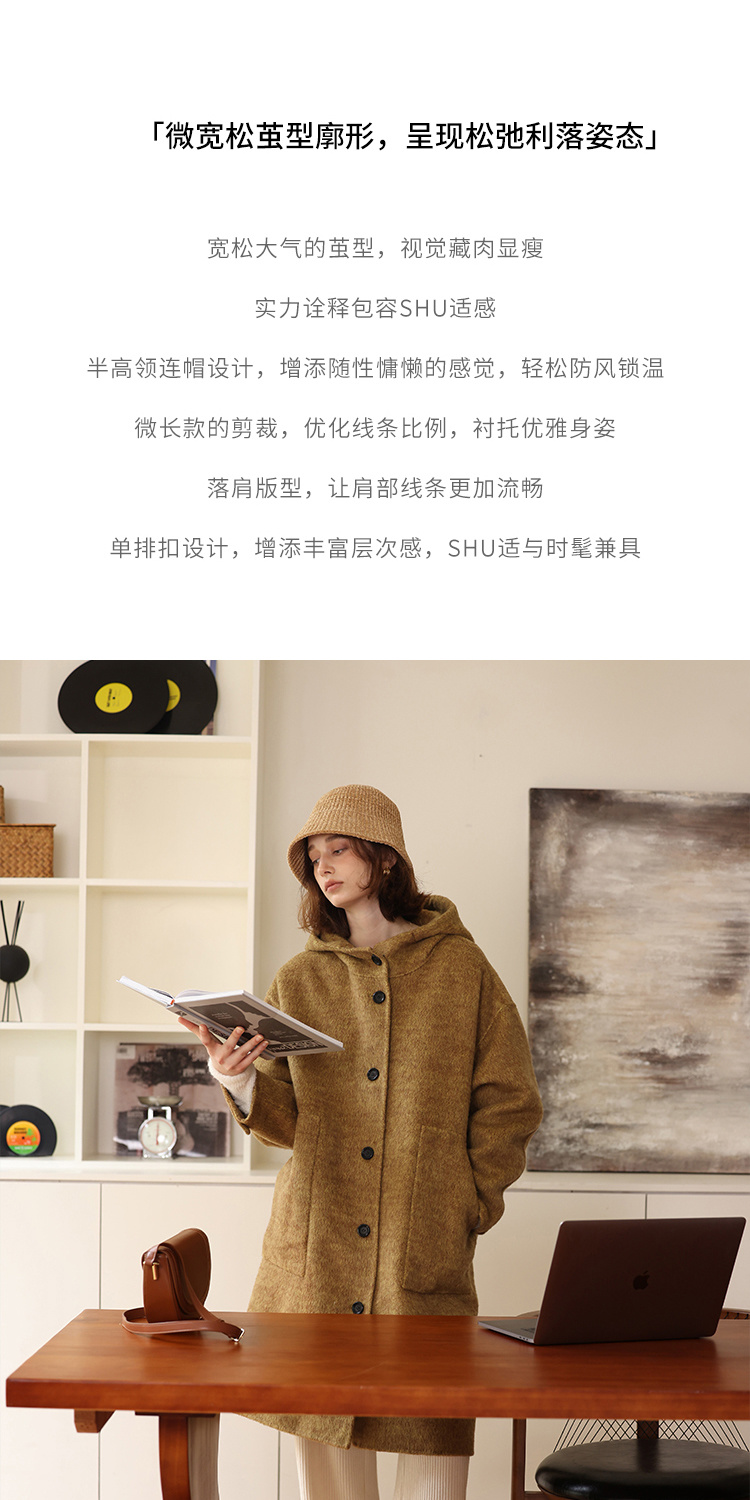 HeyDress连帽毛呢外套女秋冬宽松休闲羊毛长大衣骆驼绒气质双面呢