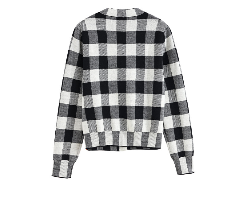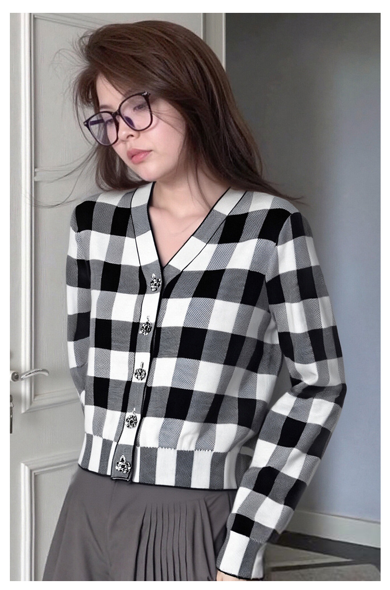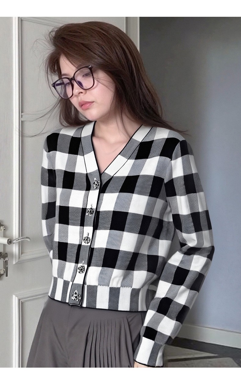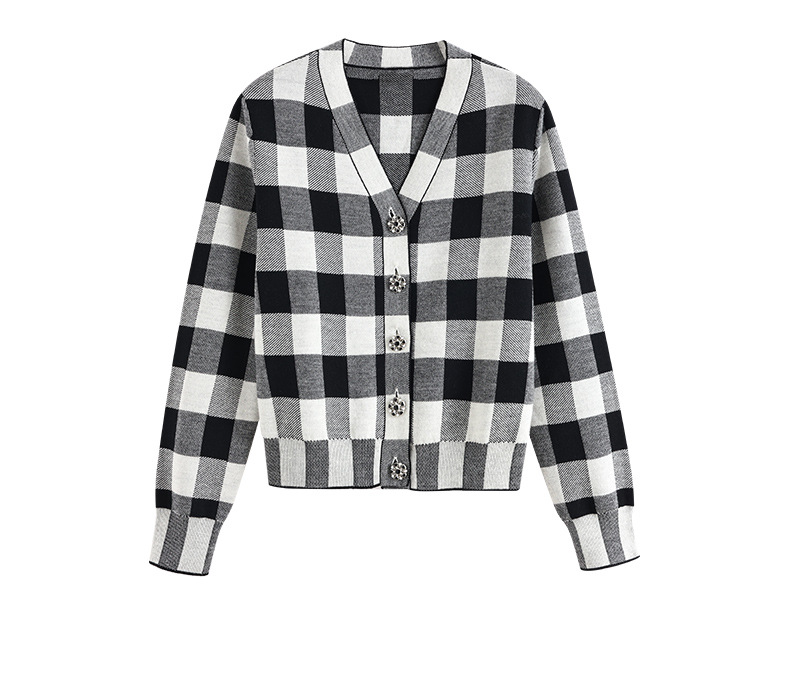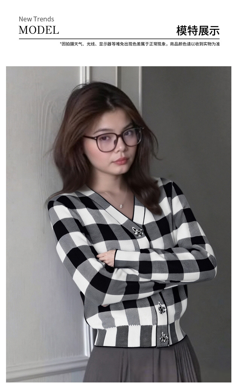 丁摩 高级感格纹单排扣针织开衫女秋季新款气质百搭休闲上衣5ZF-11454 商品图0