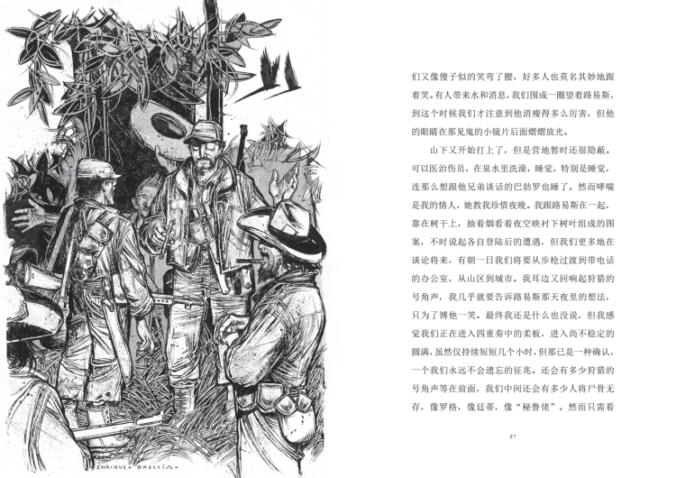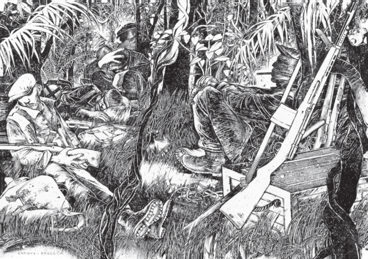 到第二天夜里,在吐出绿色的胆汁后,连路易斯也笑不出来了,再加上向北一直看不见克鲁斯岬的灯塔,我们陷入了一场超出所有人预计的灾难;如果这也能称为一次远征,真能让人难过得继续呕吐下去。总之,只要能摆脱那艘船就好,不管在陆地上等待我们的是什么——但我们早就知道是什么,所以无所谓,哪怕是挑选了最糟的时刻,哪怕是侦察机嗖嗖地飞过却拿它毫无办法,甚至跋涉在沼泽里(或者是别的什么鬼地方,反正水直没到肋骨),在红树林间泥泞的草木丛中寻找掩护,而我像个傻瓜似的靠着肾上腺素喷雾器才能前进,罗伯特帮忙扛着斯普林菲尔德步枪,减轻我在沼泽中跋涉的负担(假如这真是沼泽的话,因为我们很多人都觉得或许我们已经搞错了方向,登上的不是陆地而是距古巴岛二十海里外的一个烂泥礁……)。