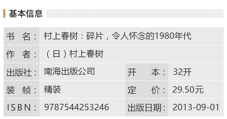 关于村上春树↓↓ 《袭击面店》村上春树反思之作:当你饥肠辘辘的时候,你*想做些什么? 《大萝卜和难挑的鳄梨》:村上春树**作品,《达文西》“年度散文”名,画家大桥步精心配配制插图 《当我谈跑步时,我谈些什么》:与诺贝尔文学奖擦身而过的作家村上春树**本只写自己的书 《没有色彩的多崎作和他的巡礼之年》:村上春树突破之作!迄今*不一样的村上小说! 《无比芜杂的心绪》:村上春树出道以来*重要随笔集,明确对世界表达看法 《眠》:村上春树觉醒之作!无眠的世界,你能做些什么? 《天黑以后》:与诺贝尔文学奖擦身而过的作家,村上春树关于孤独的经典之作,全新译本! 《1Q84BOOK1,2,3》:村上春树创作30年**杰作!盒装收藏版《悉尼!》:与诺贝尔文学奖擦身而过的作家村上春树谈奥运 ★继《无比芜杂的心绪》《眠》双双畅销,村上春树*有趣的书《碎片》登场★村上春树写下自己*有意思的故事 ★零距离接触村上春树,满眼都是美妙的话题,原来世界这么有趣!★这些碎片试着依照顺序读下来,忽然觉得,虽说这个世界上有一堆这样那样的事情,可是还真有趣啊。村上春树