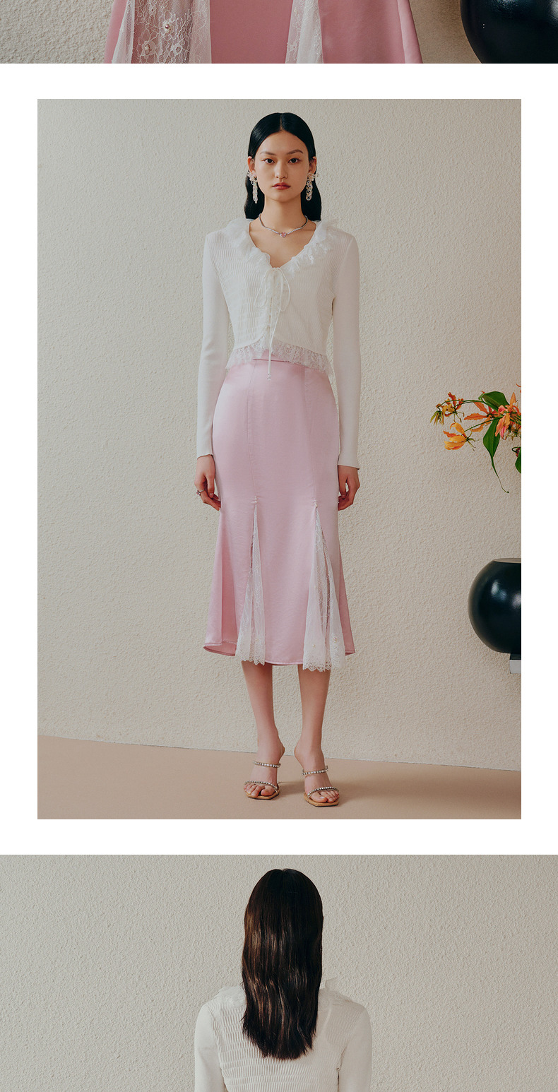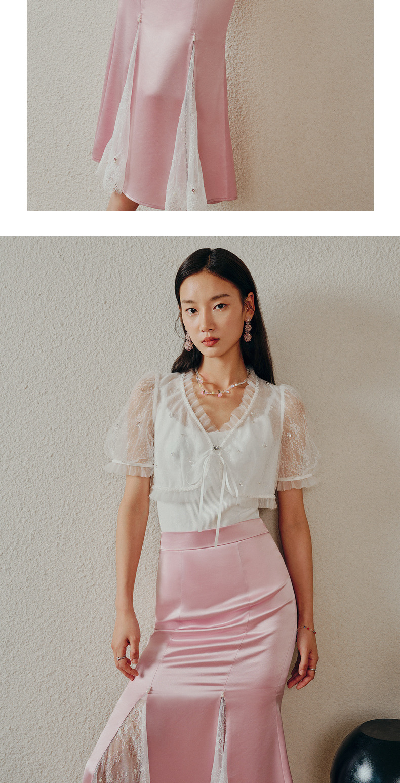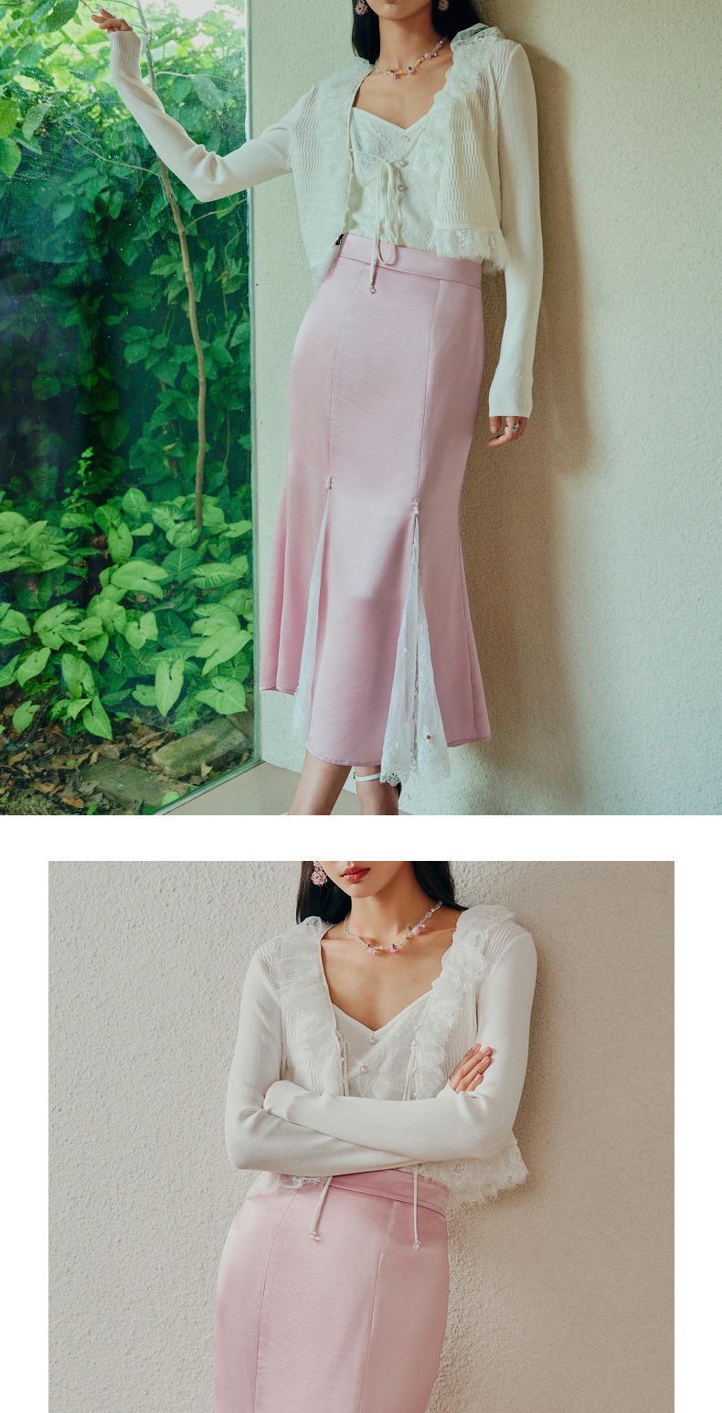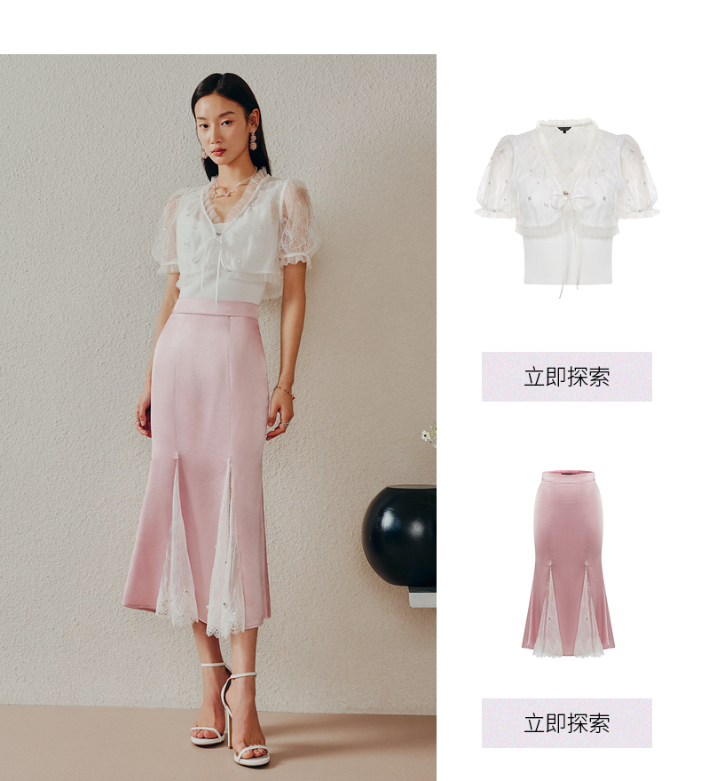 MAXRIENY浪漫优雅感樱花粉蕾丝拼接鱼尾缎面半裙(货号:MC88SK259)