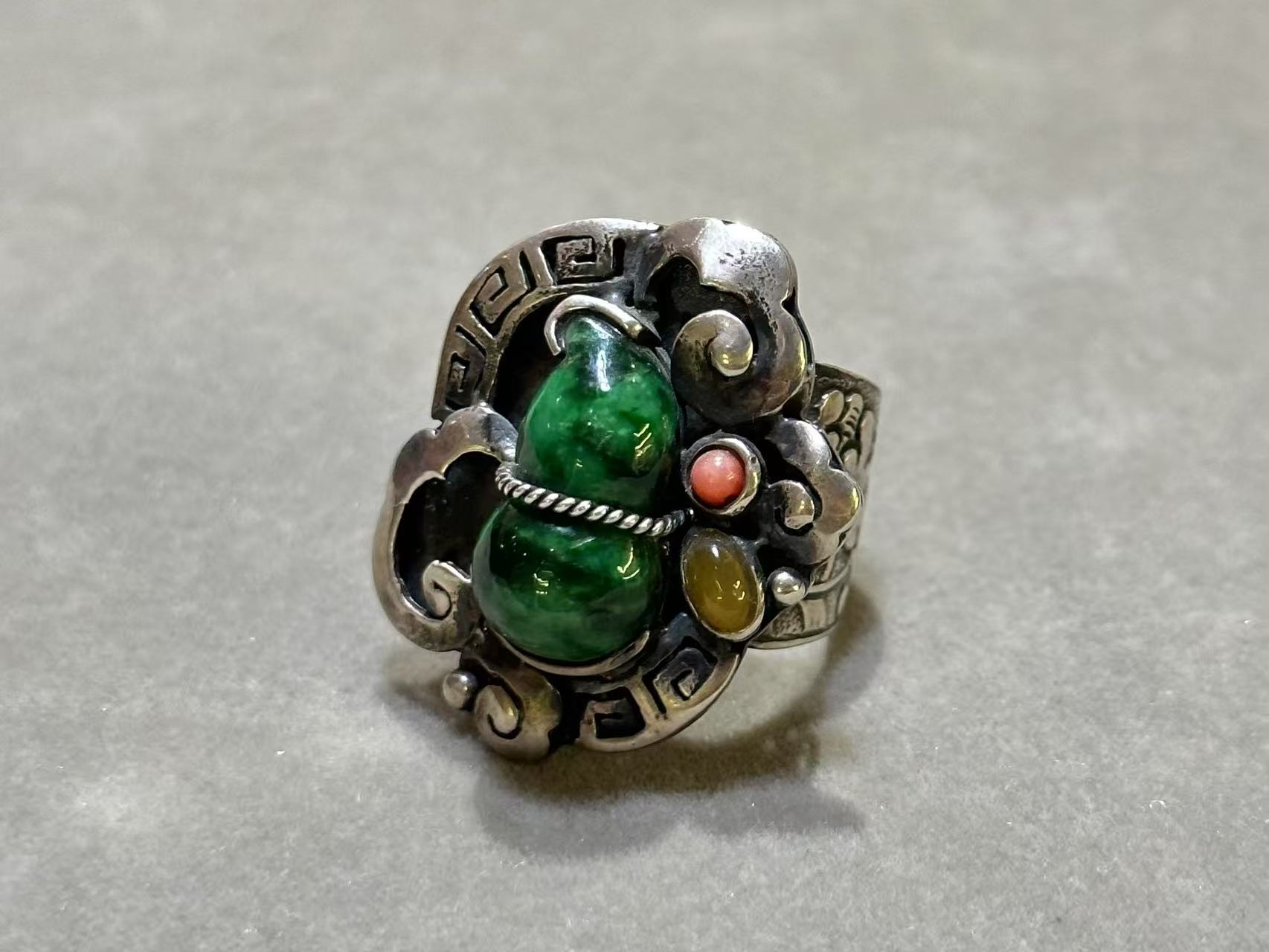 翡翠多宝镶嵌尼泊尔银饰戒指