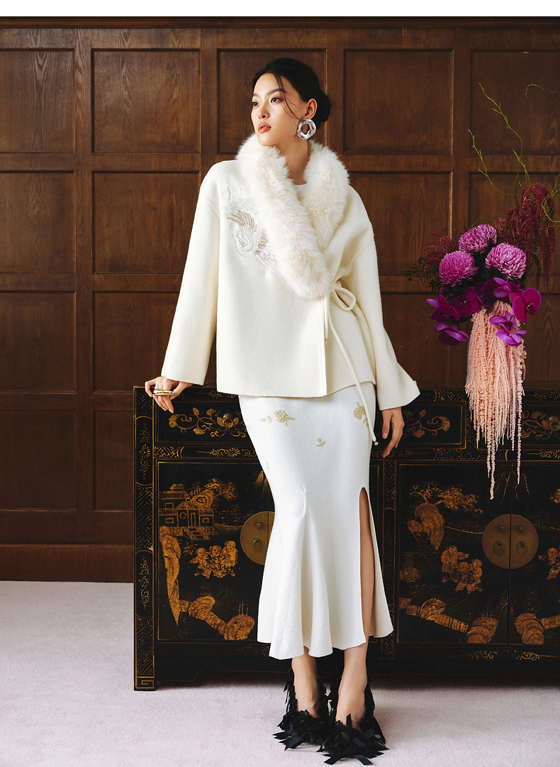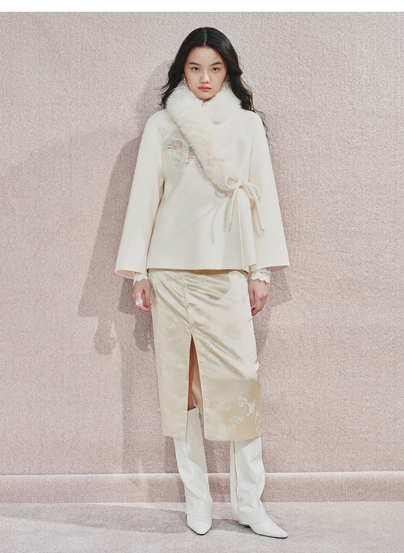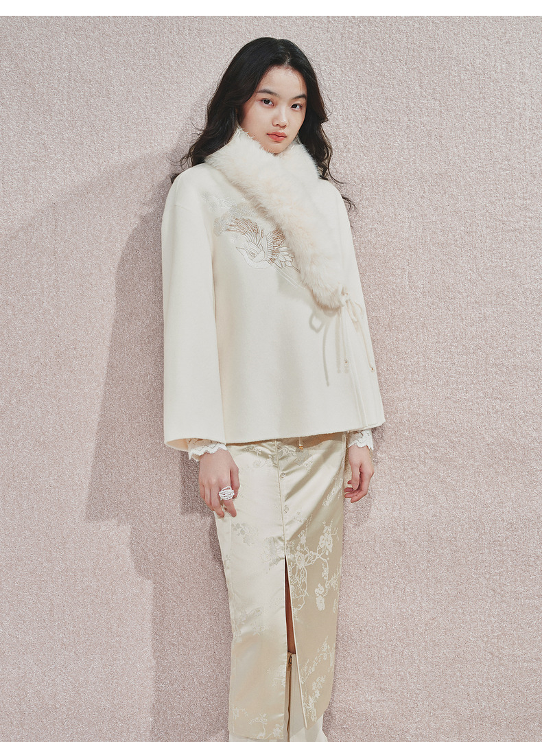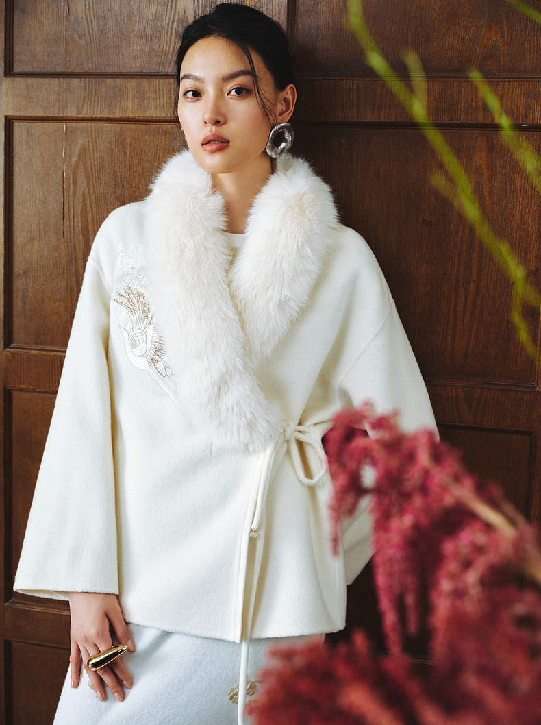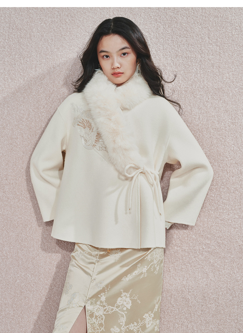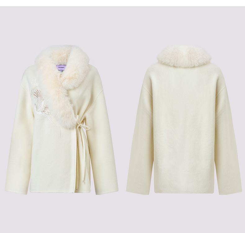 MAXRIENY贵雅新中式绵羊毛大衣24年冬新款刺绣廓形大毛领外套澳毛(货号:MS85CT759)