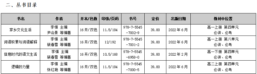 “思辨性阅读与表达”是《普通高中语文课程标准(2017年版2020年修订)》中18个学习任务群之六,出现在高二年级上册第四单元。《逻辑的力量》一书分为五个章节,每章节分为“知识储备”与“情境应用”两个部分,不仅向学生介绍一些基本的逻辑理论、推理方法等,重点是让学生在具体情境中探究逻辑规律、掌握规范、厘清标准、领悟方法。此外,本书还增加了高考背景下逻辑知识应用的内容,最终培养学生的语文思维能力与理性精神。
