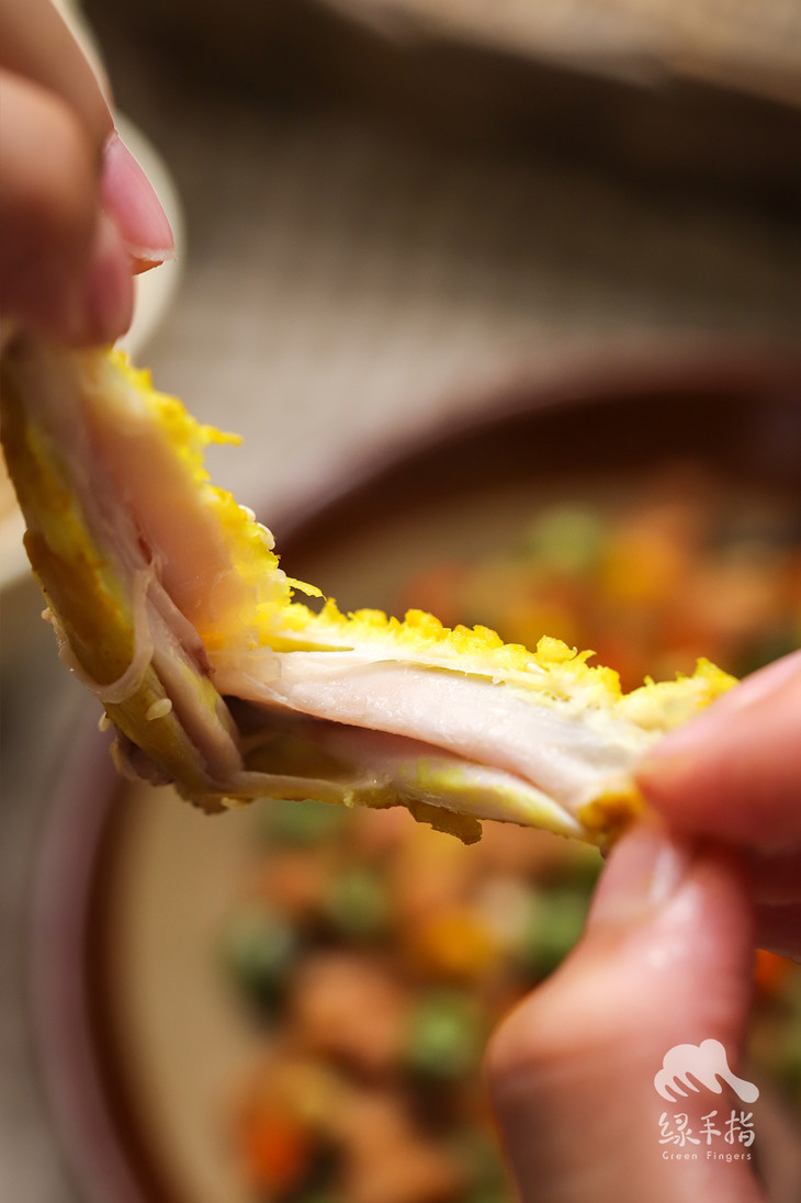 经过盐焗的鸡肉,鸡皮金黄酥脆,入口香脆,我们盐焗鸡选用的是农场自养殖的生态清远鸡,150日龄出栏的嫩鸡,盐香混合着鸡肉的鲜美。