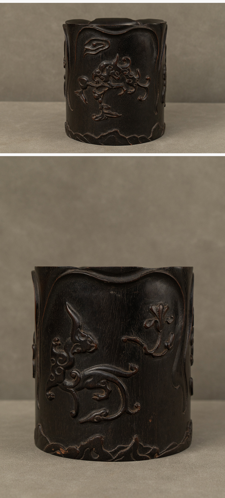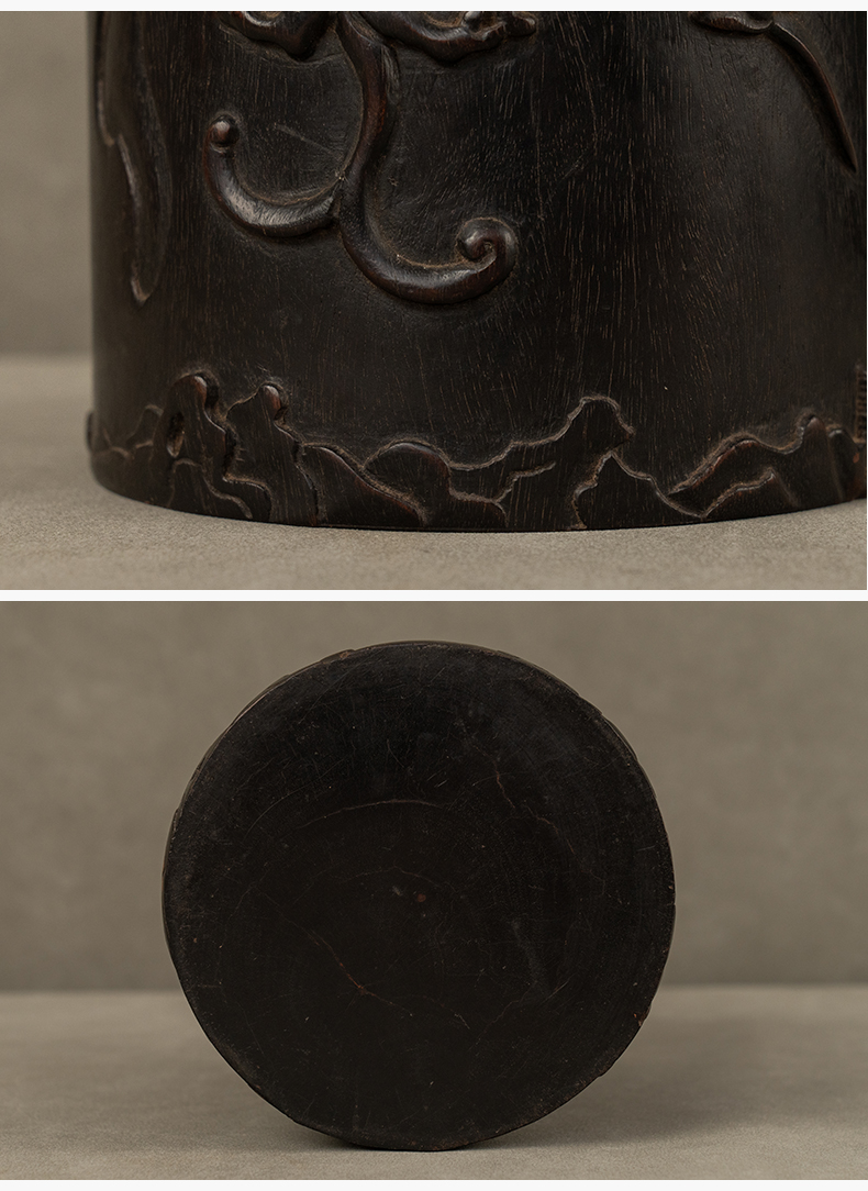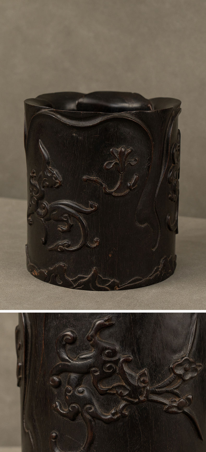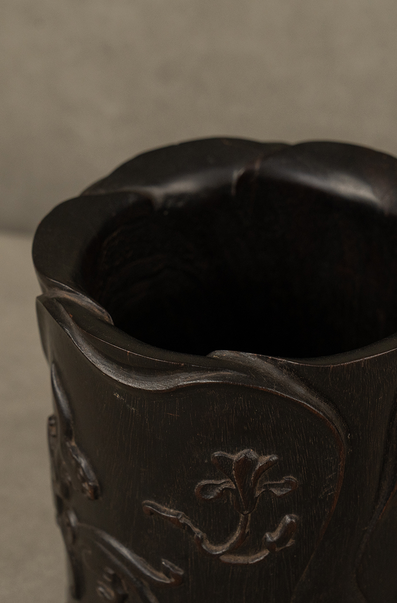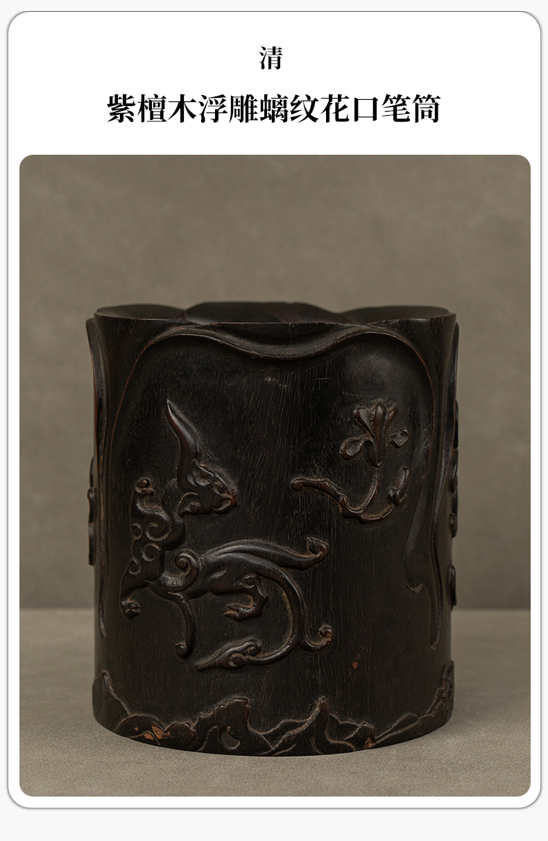 清 紫檀木浮雕螭纹花口笔筒