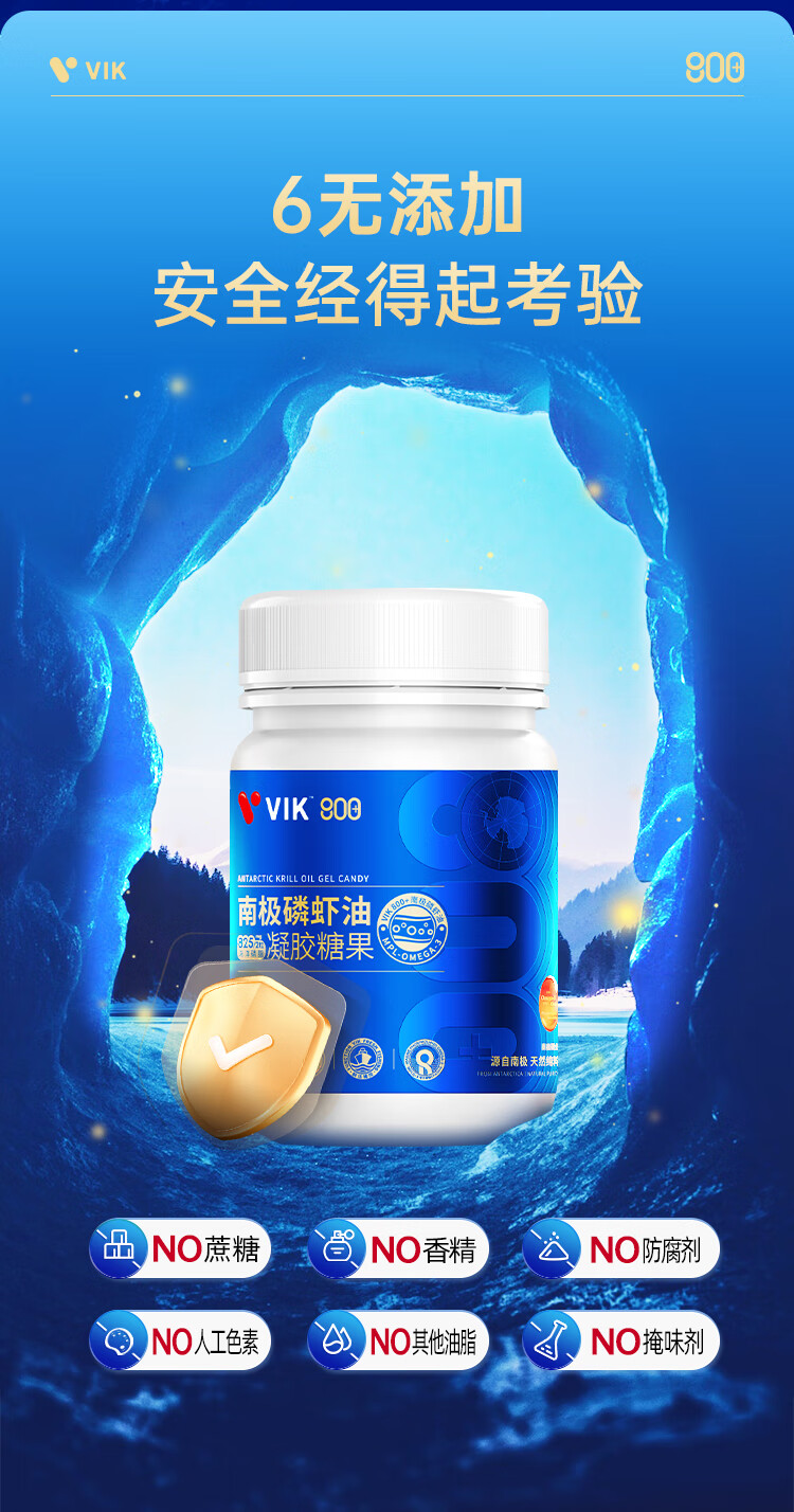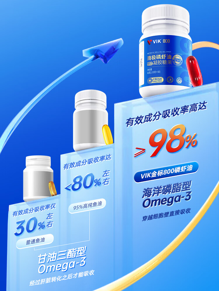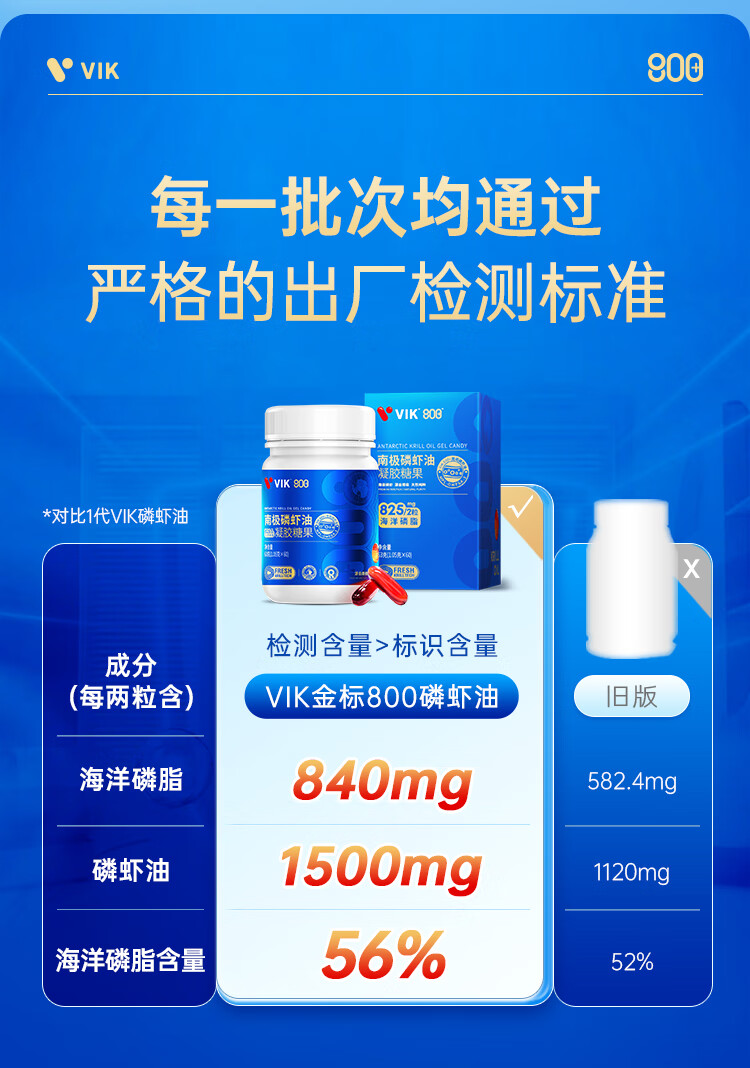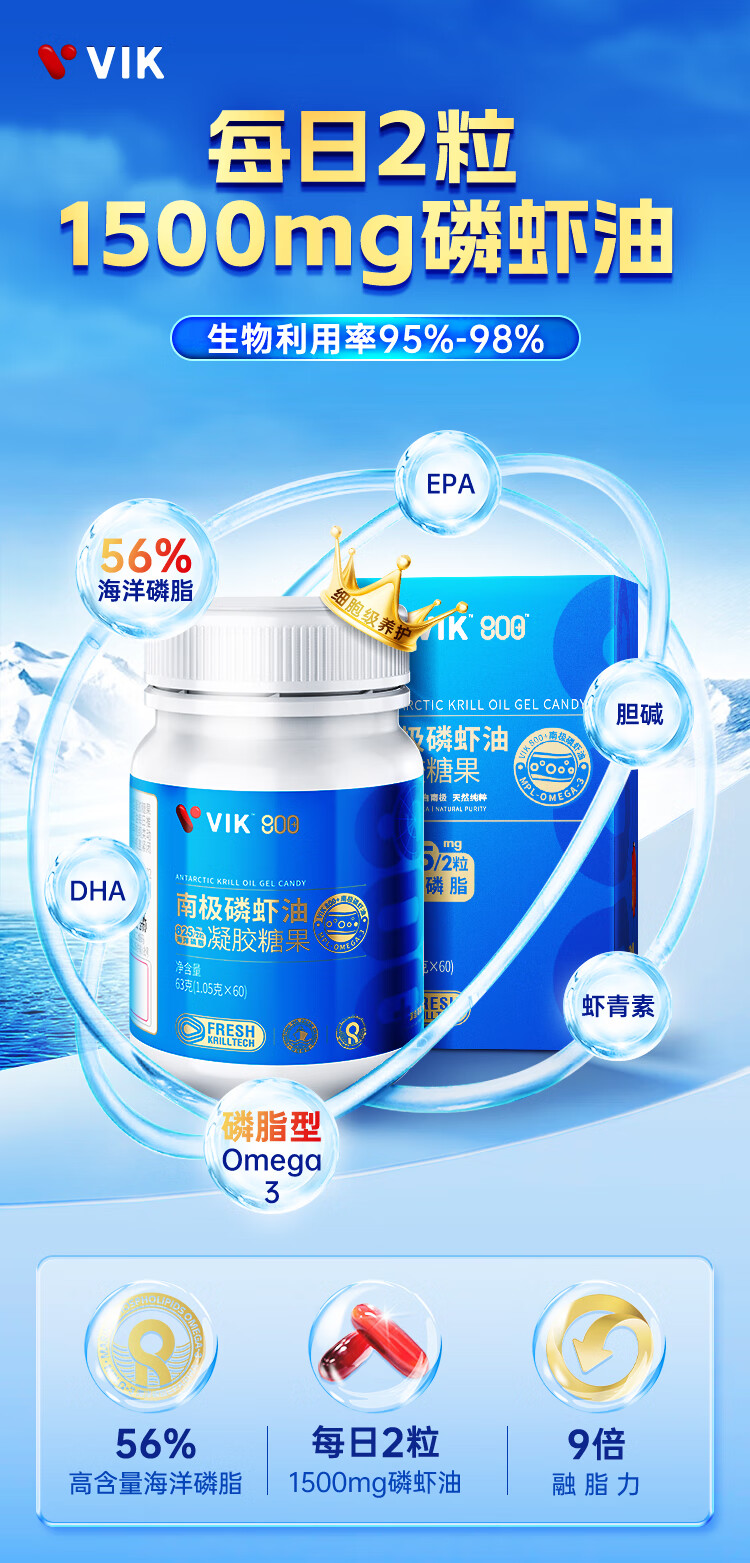VIK纯南极磷虾油60粒56%海洋磷脂金标800深海鱼油升级高纯度强吸收Omega-3DHAepa虾青素中老年成人易吞服送礼