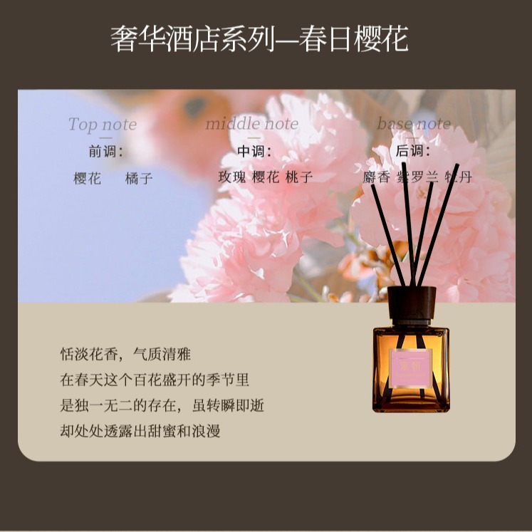 【香型】春日樱花(樱花季限定)、雅韵白茶(威斯汀酒店同款)、香草樱恋(希尔顿酒店同款)、溪地假日(万豪酒店同款)、春日晚风(洲际酒店同款)