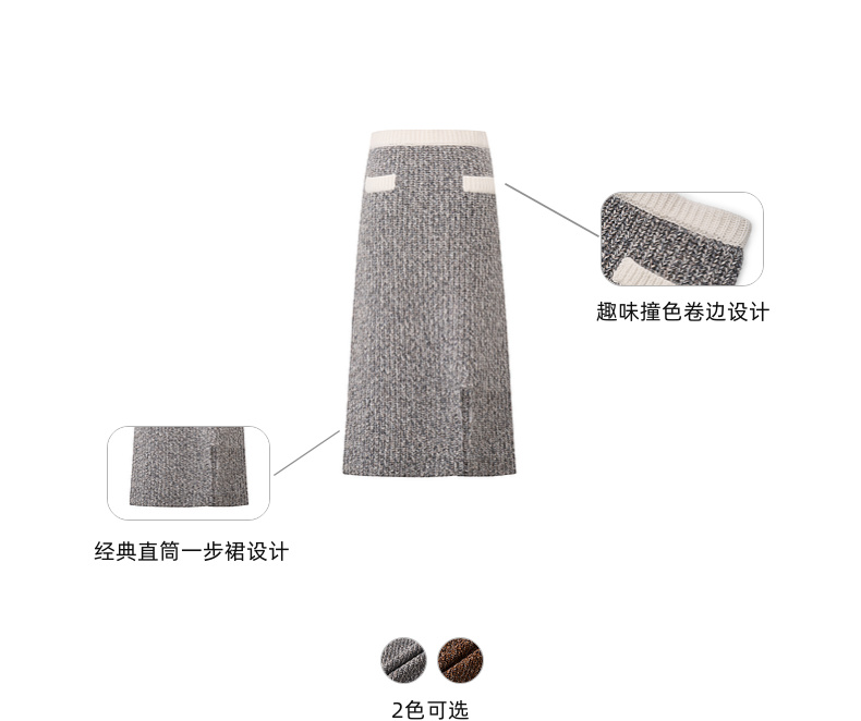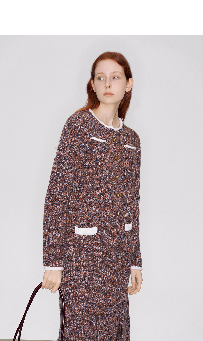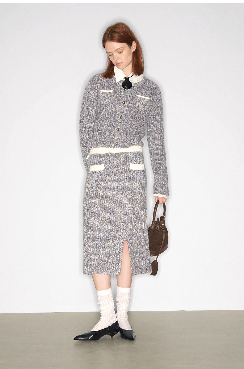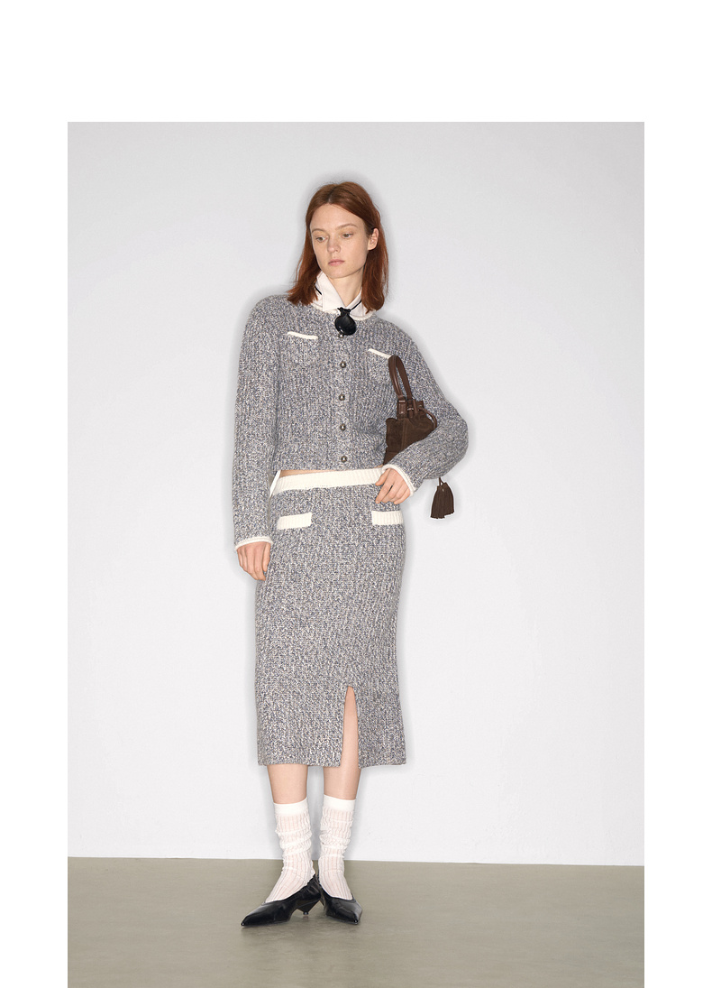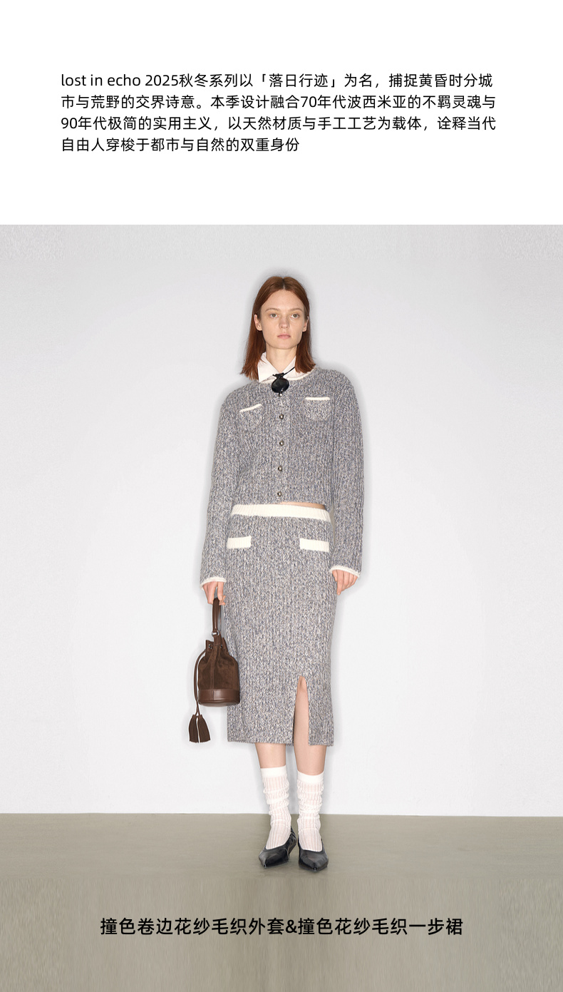 lost in echo2025早秋新款撞色卷边花纱毛织短外套直筒开衩一步裙