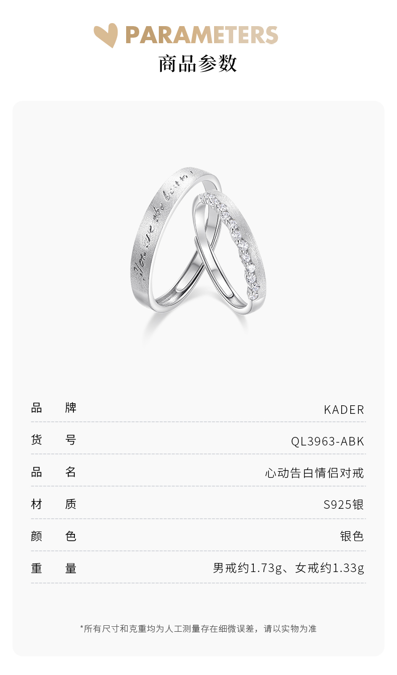 卡蒂罗KADER 心动告白情侣对戒 钟爱久久心动邂逅浪漫爱情简约素圈可调节一对 永恒不变甜蜜饰爱