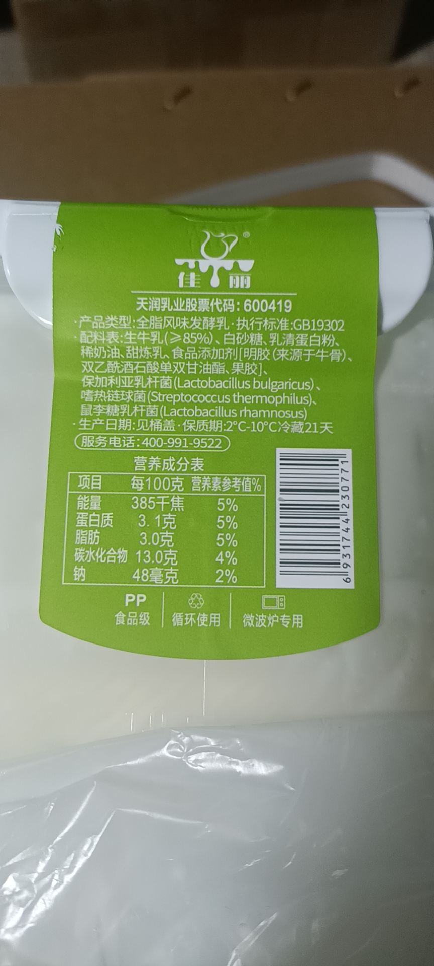 【配料表】生牛乳(≥85%)、白砂糖、乳清蛋白粉、稀奶油、甜炼乳、食品添加剂[明胶(来源于牛骨)、双乙酰酒石酸单双甘油酯、果胶]、保加利亚乳杆菌(Lactobacillus bulgaricus)、嗜热链球菌(Streptococcus thermophilus)、鼠李糖乳杆菌(Lactobacillus rhamnosus)