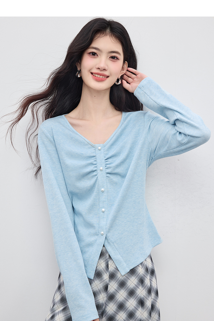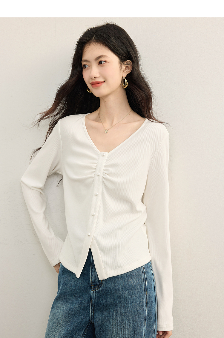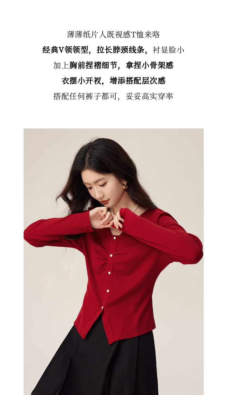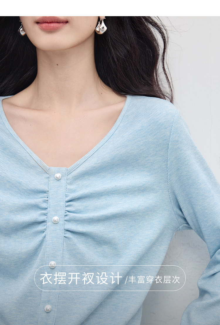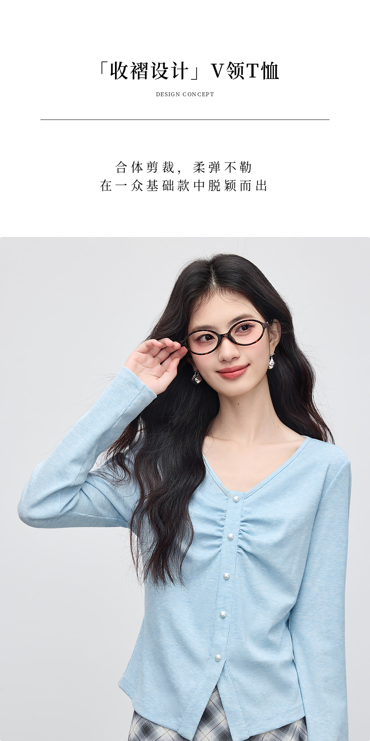 【08/12新品】熙世界收褶正肩V领长袖t恤女2025秋季新款设计感修身显瘦卡腰上衣