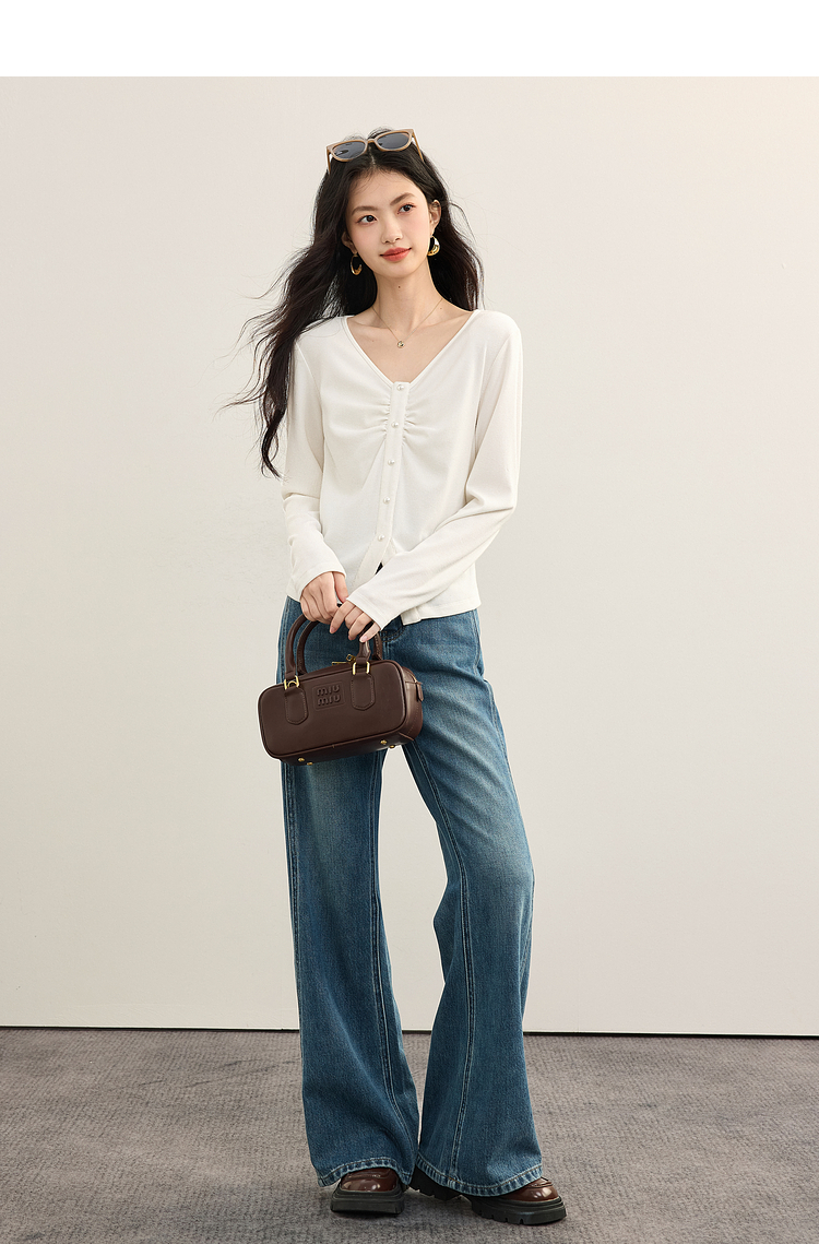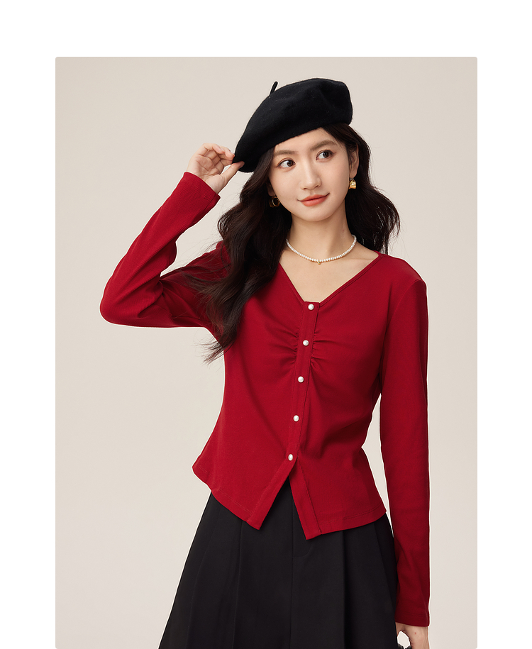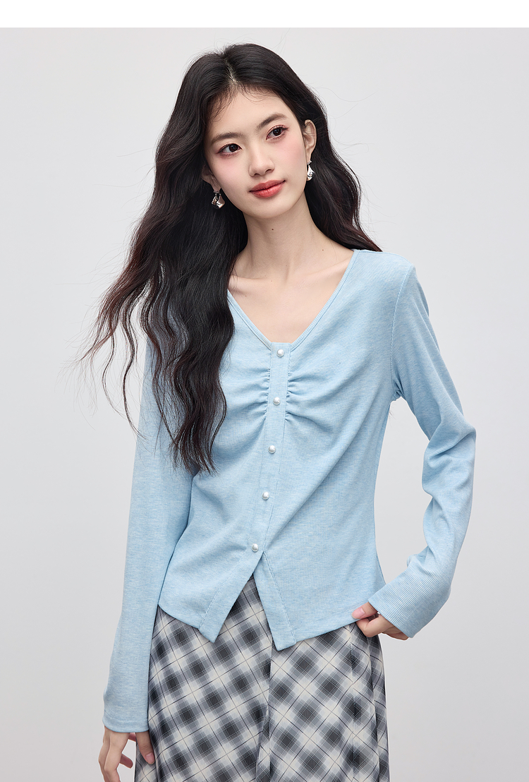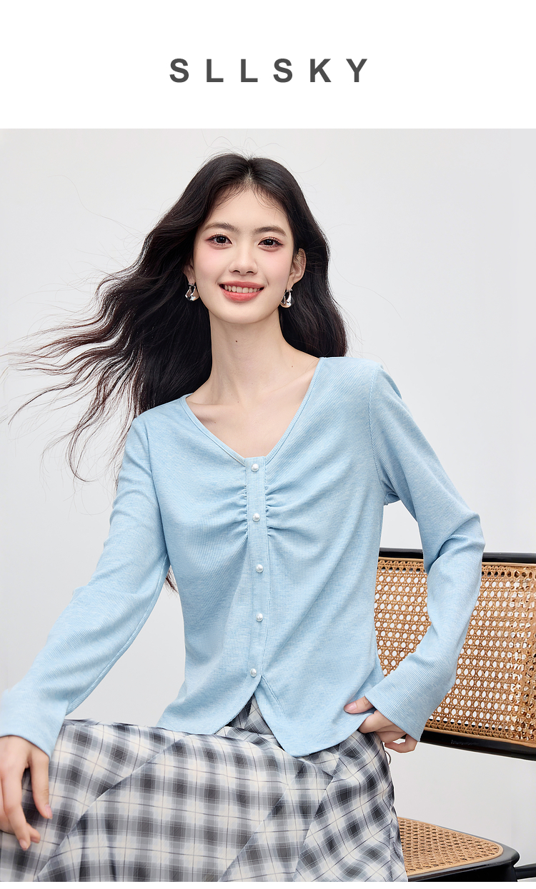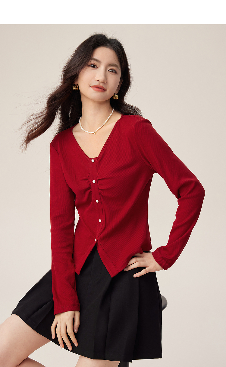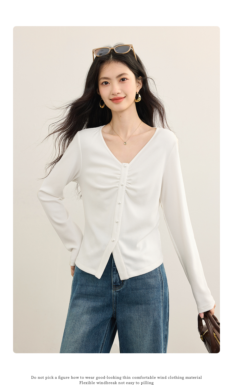 【08/12新品】熙世界收褶正肩V领长袖t恤女2025秋季新款设计感修身显瘦卡腰上衣