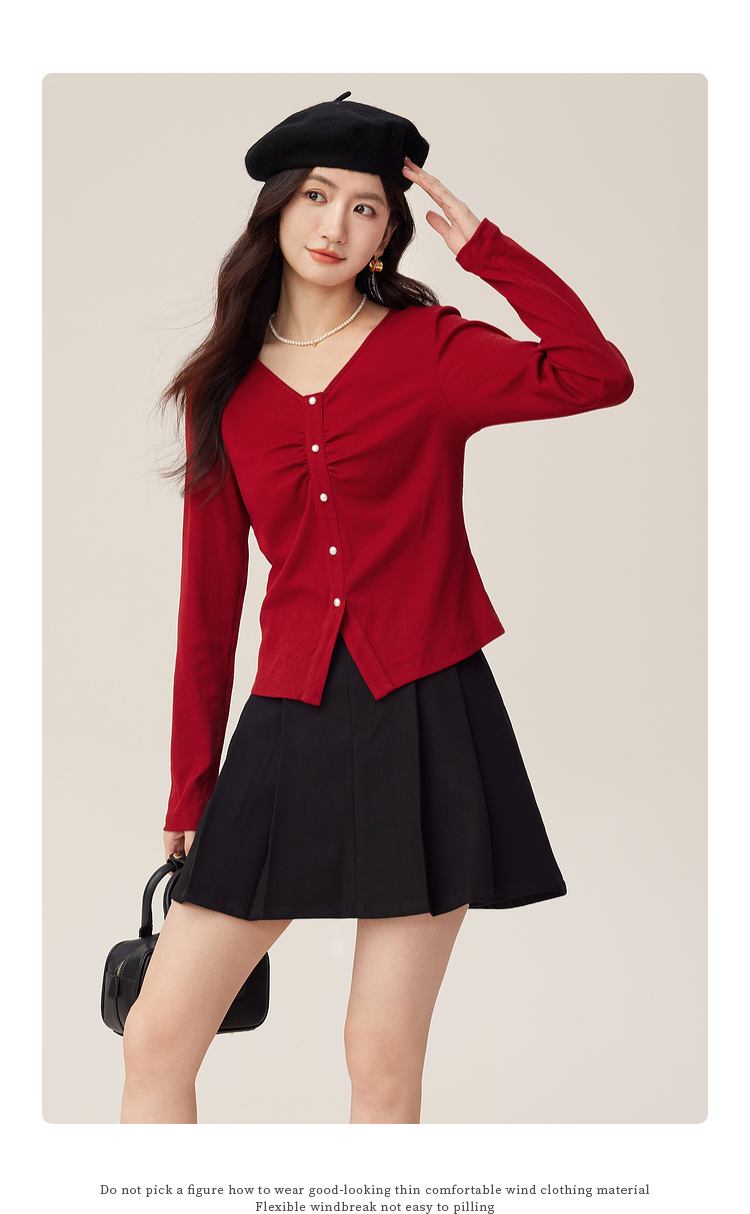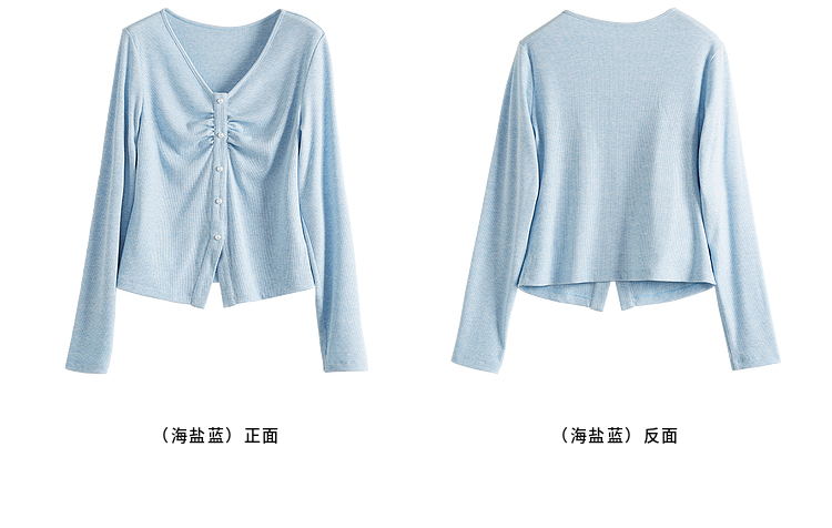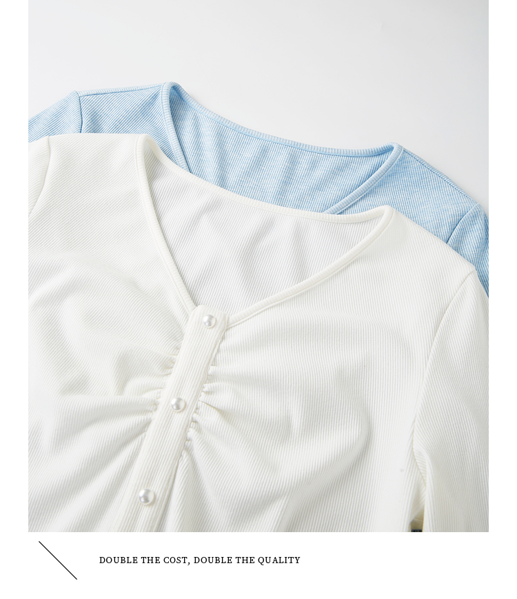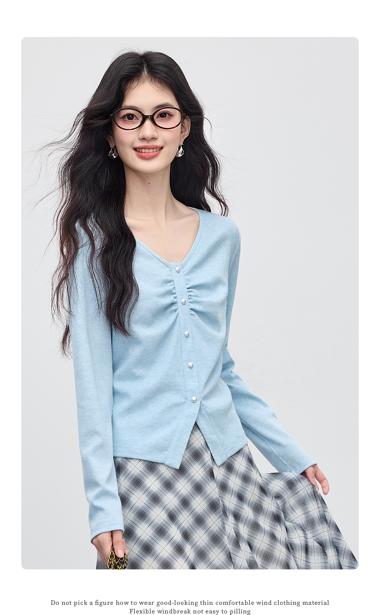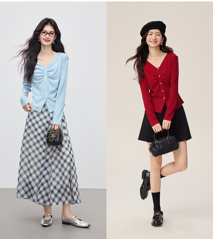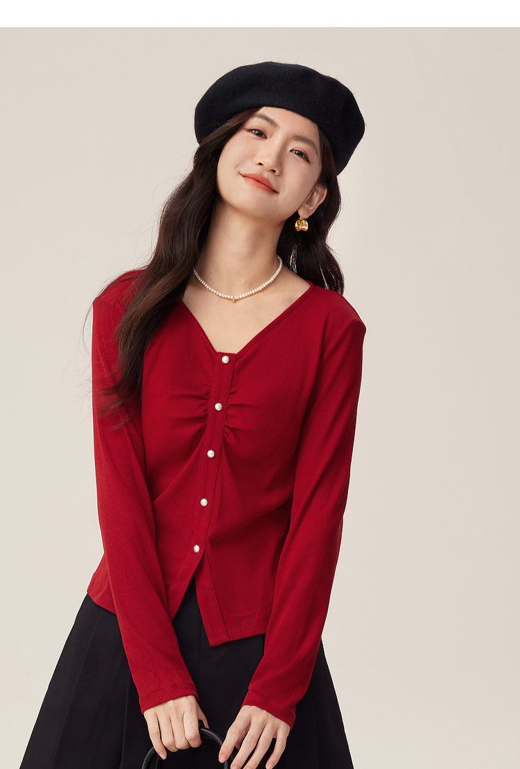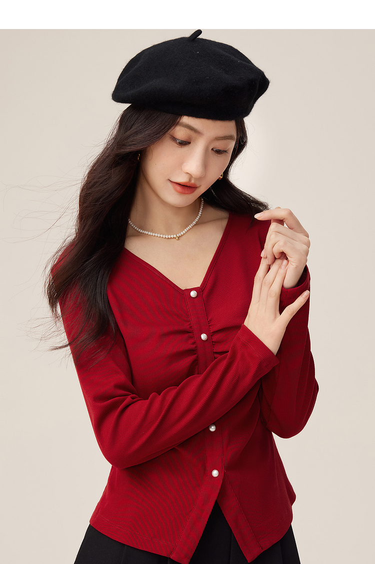 【08/12新品】熙世界收褶正肩V领长袖t恤女2025秋季新款设计感修身显瘦卡腰上衣