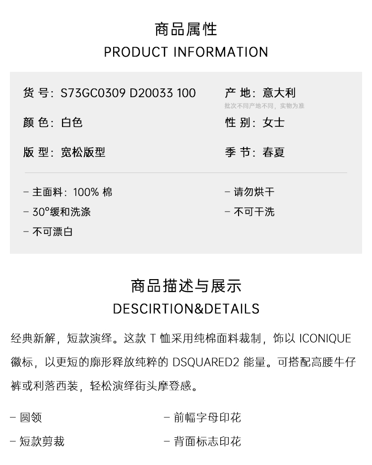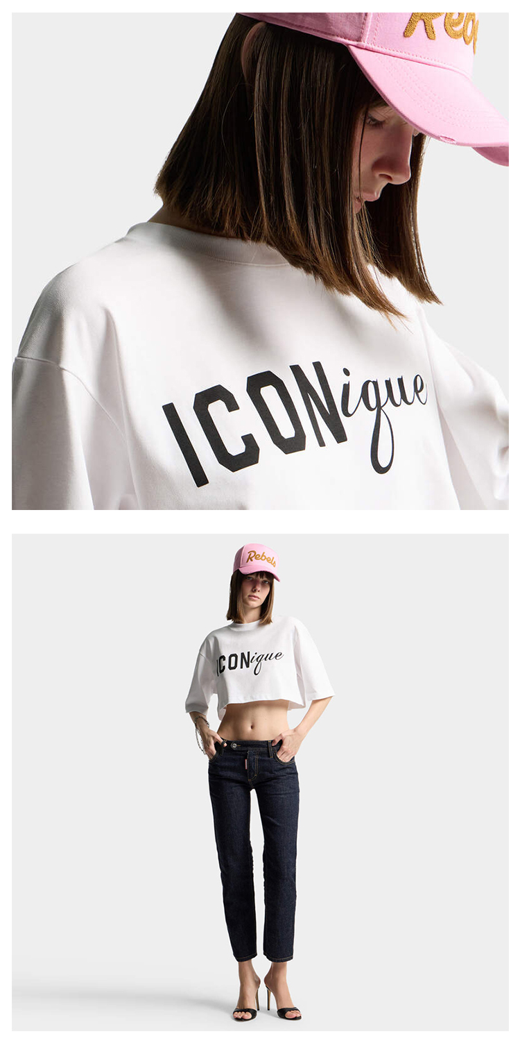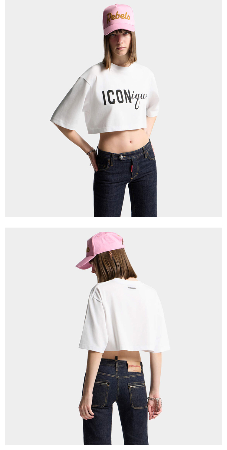DSQUARED2 女士字母徽标印花棉质圆领短袖短款T恤 S73GC0309 D20033 100