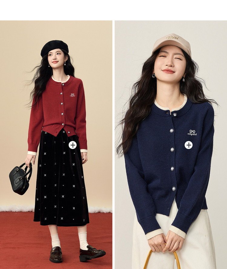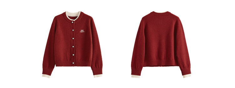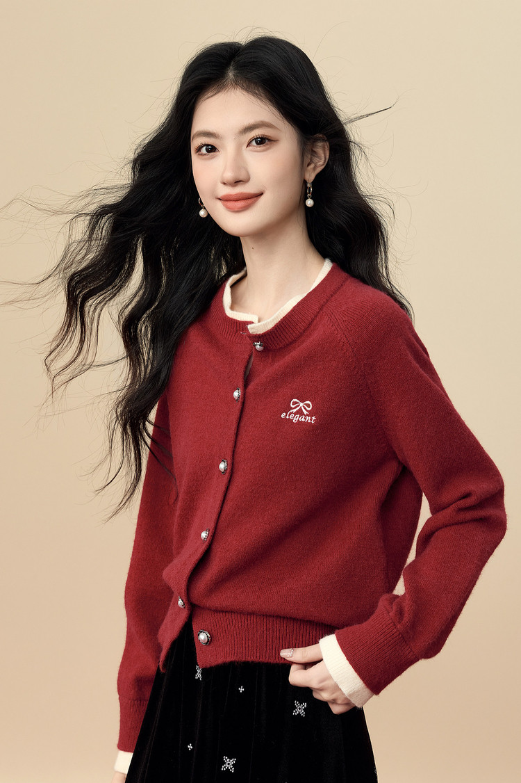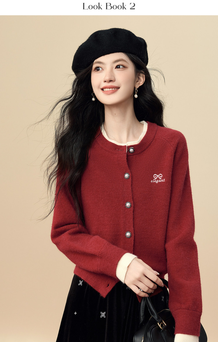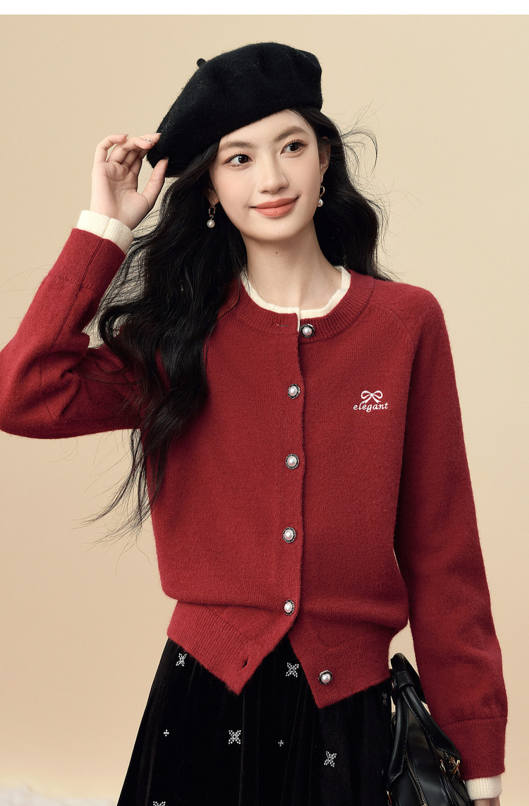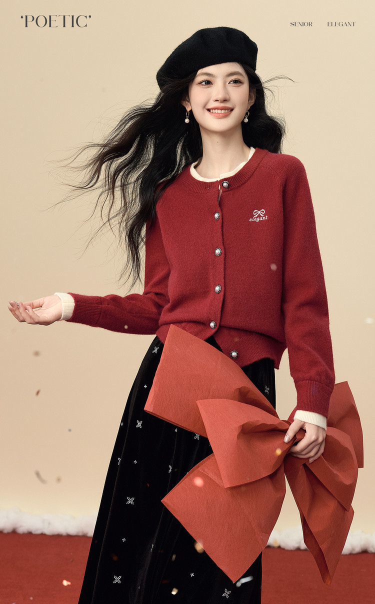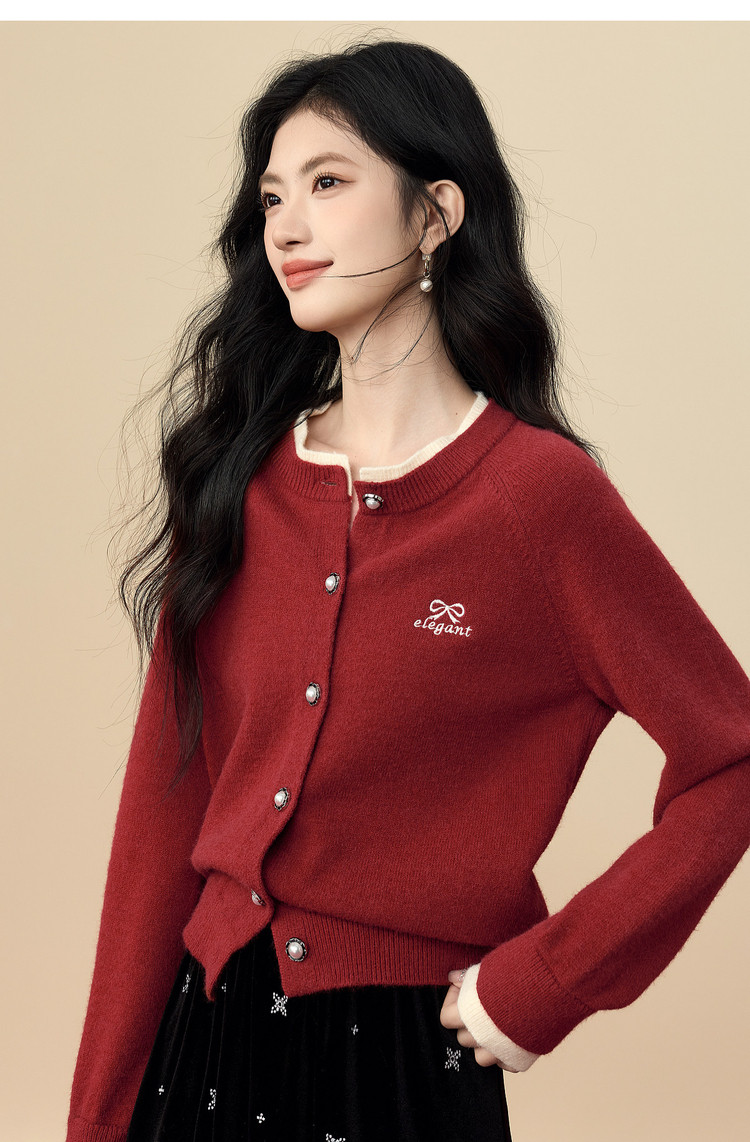 【12/24新品6.5折】熙世界学院风蝴蝶结刺绣针织衫女秋冬长袖短外套红色圣诞开衫毛衣