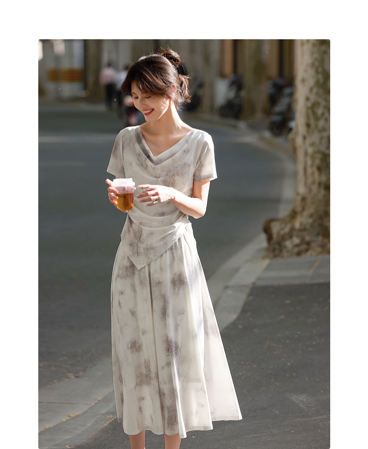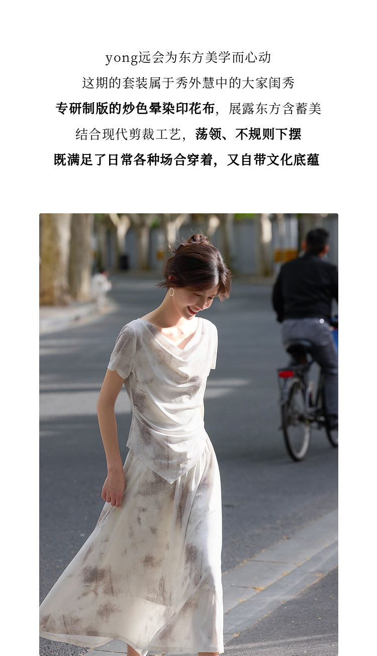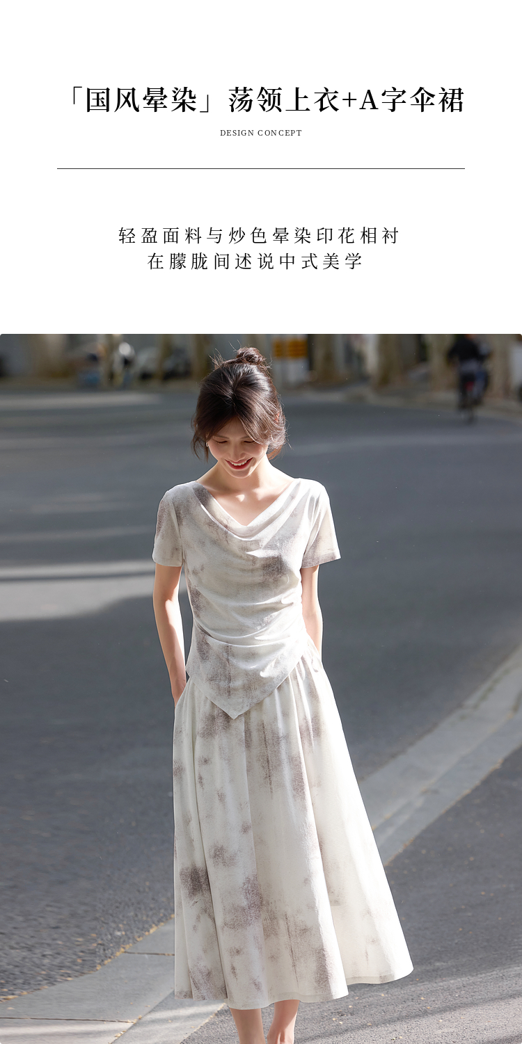 【07/16新品】熙世界轻国风复古晕染套装女2025夏装新款荡领上衣A字伞裙两件套
