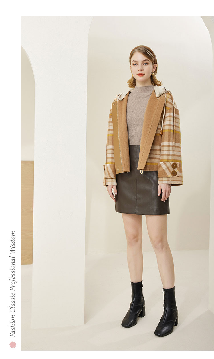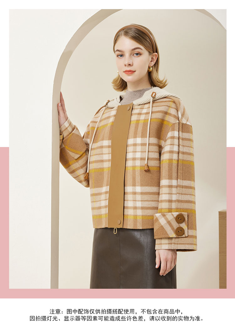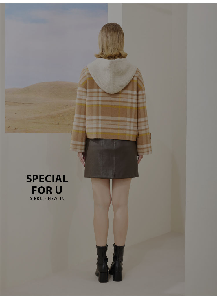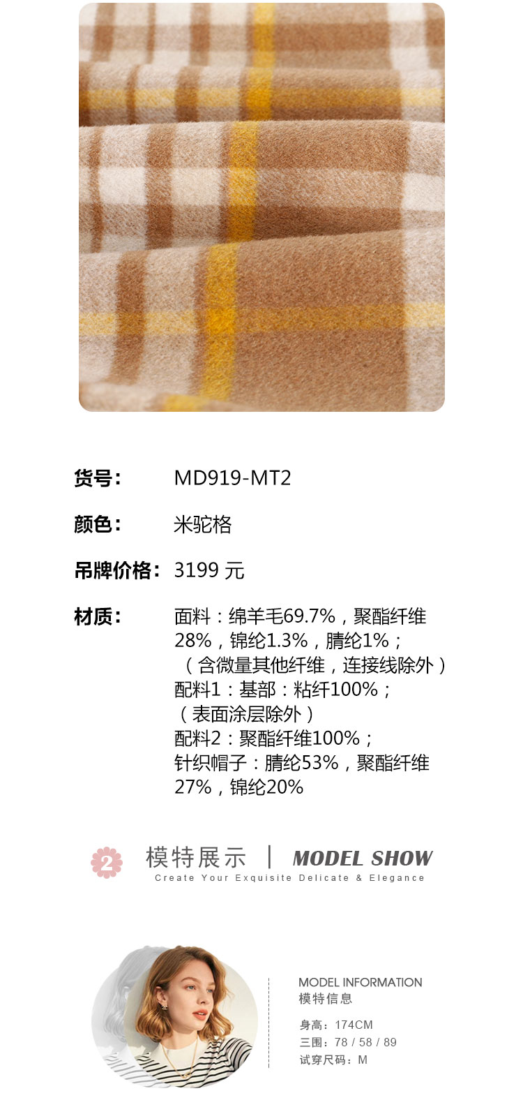 MD919斯尔丽瑟俪2022年冬上新时尚格纹拼针织帽大衣