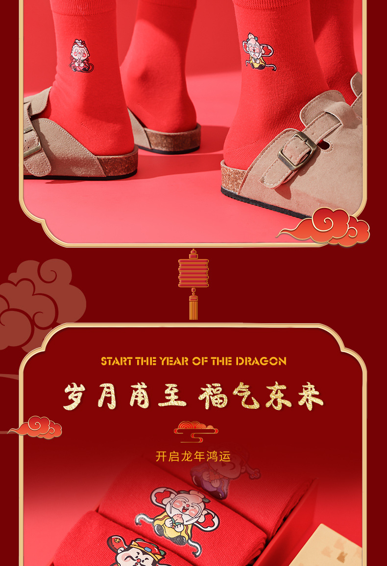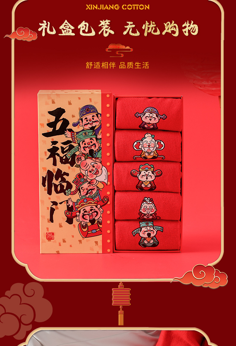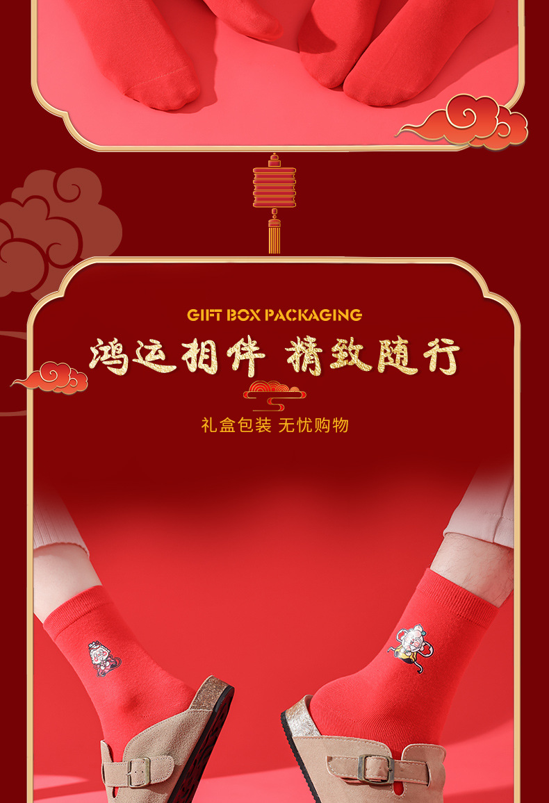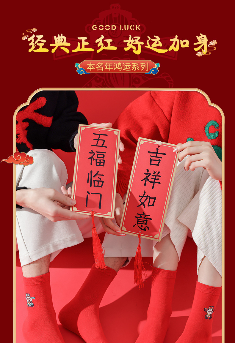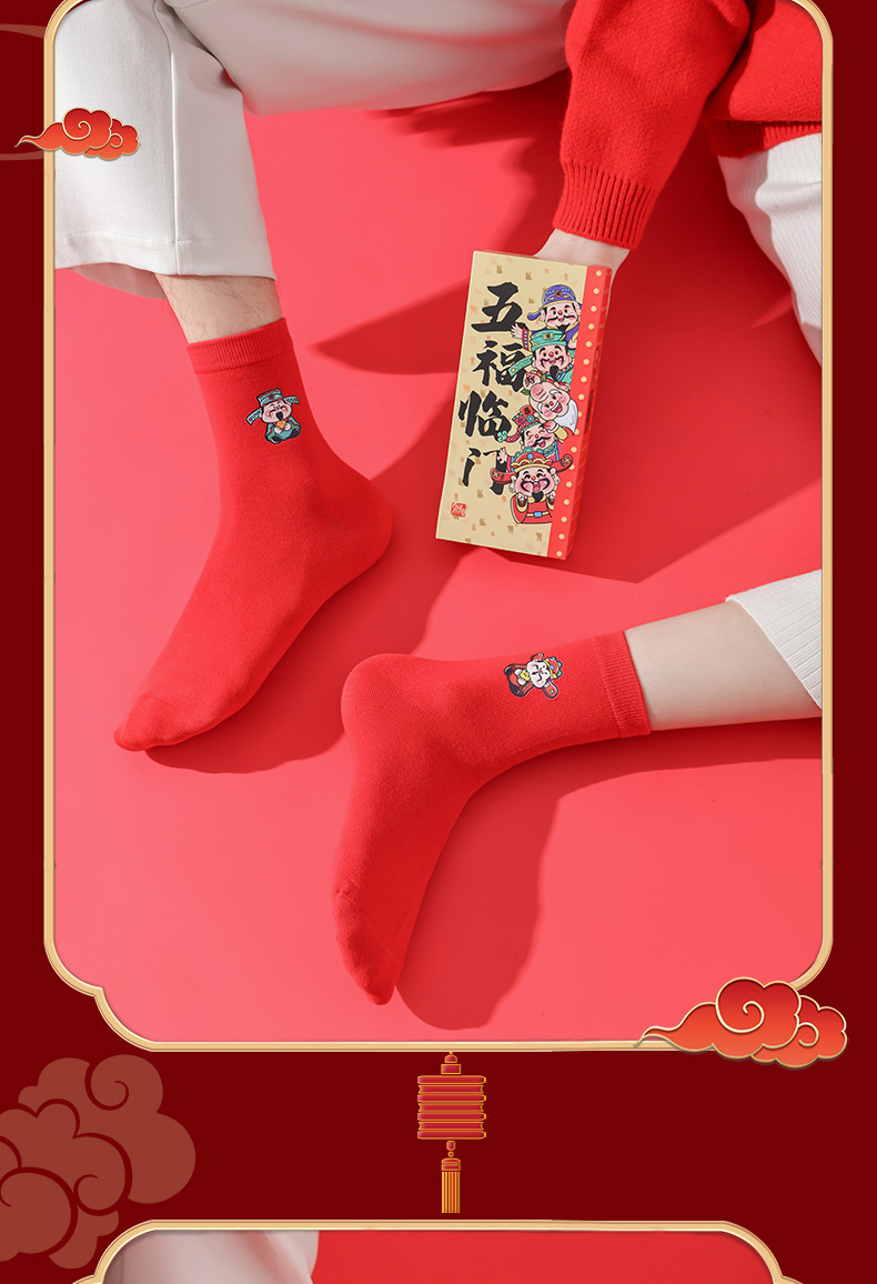 五福临门袜子【龙年刺绣红袜子礼盒装】本命年 男女 双针中筒袜