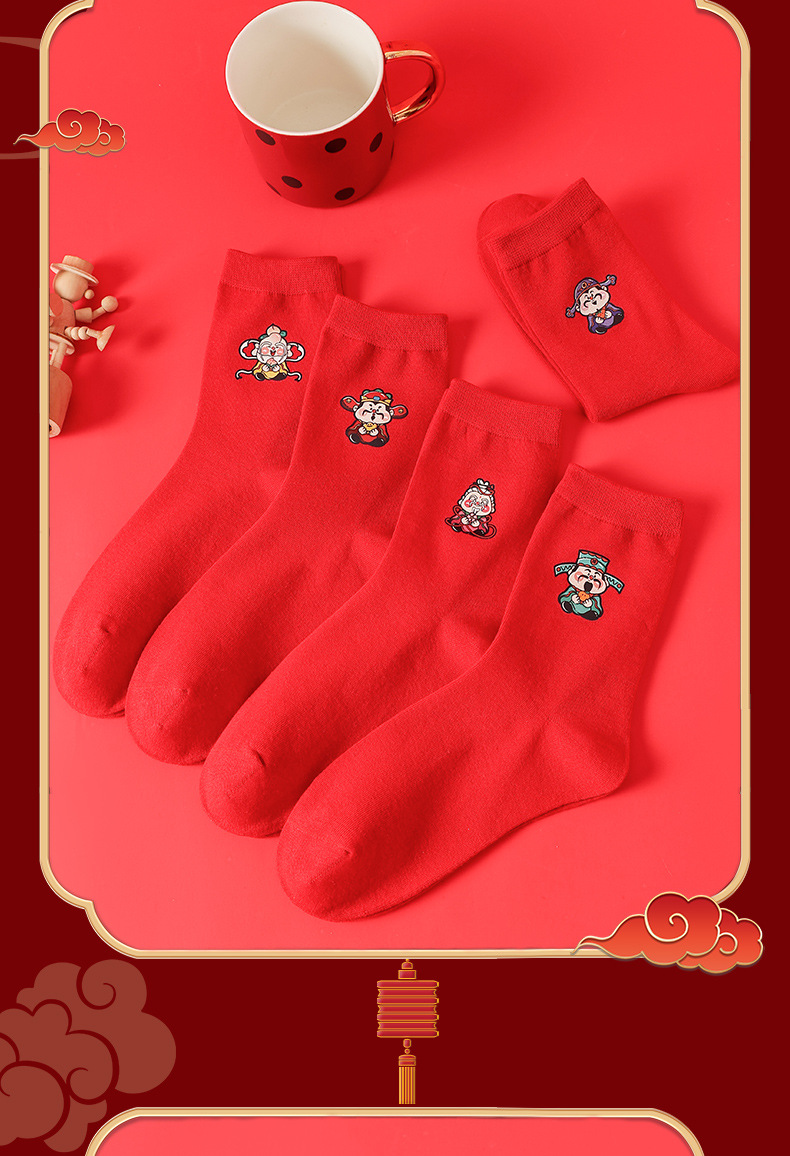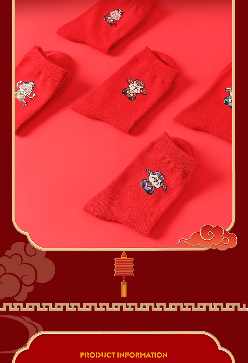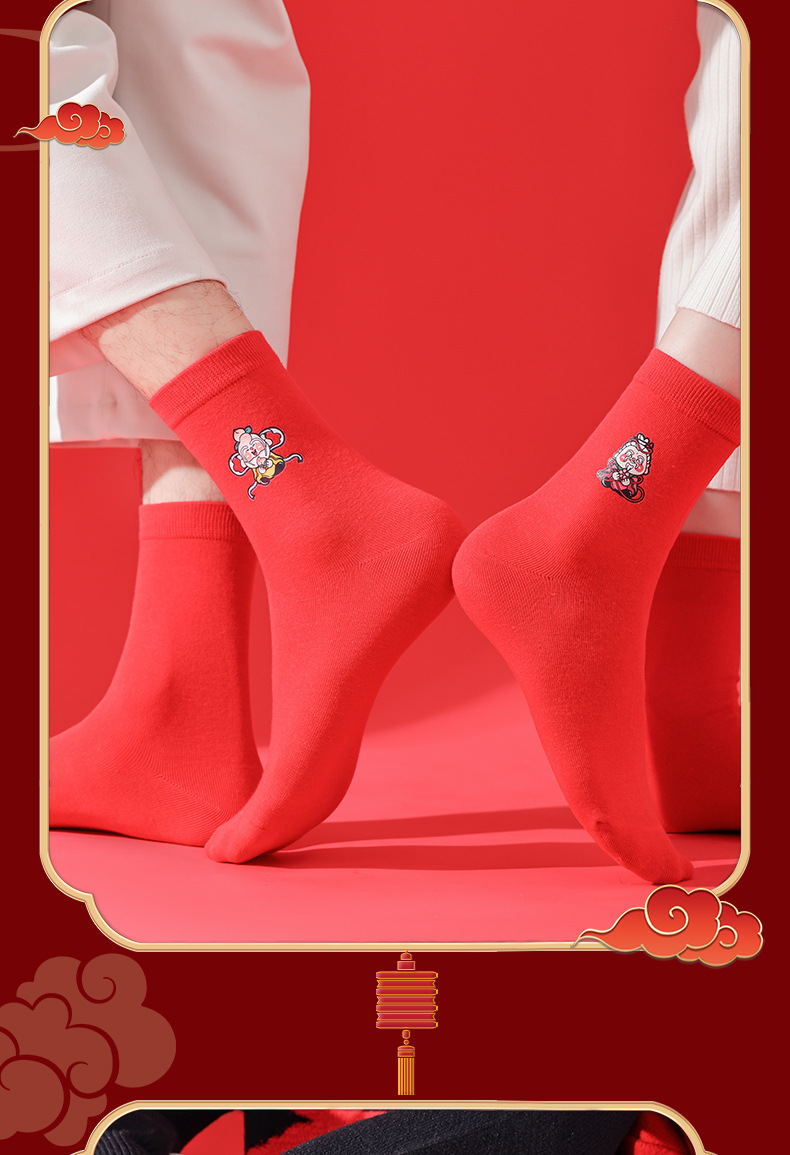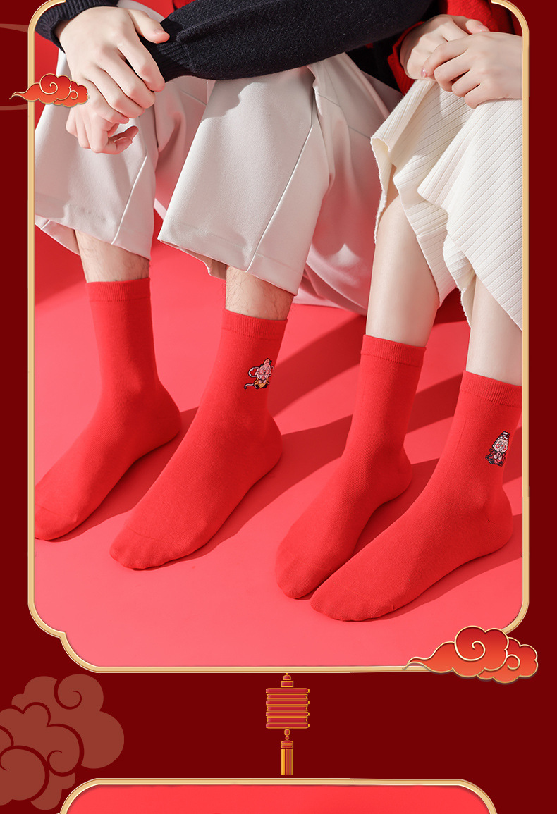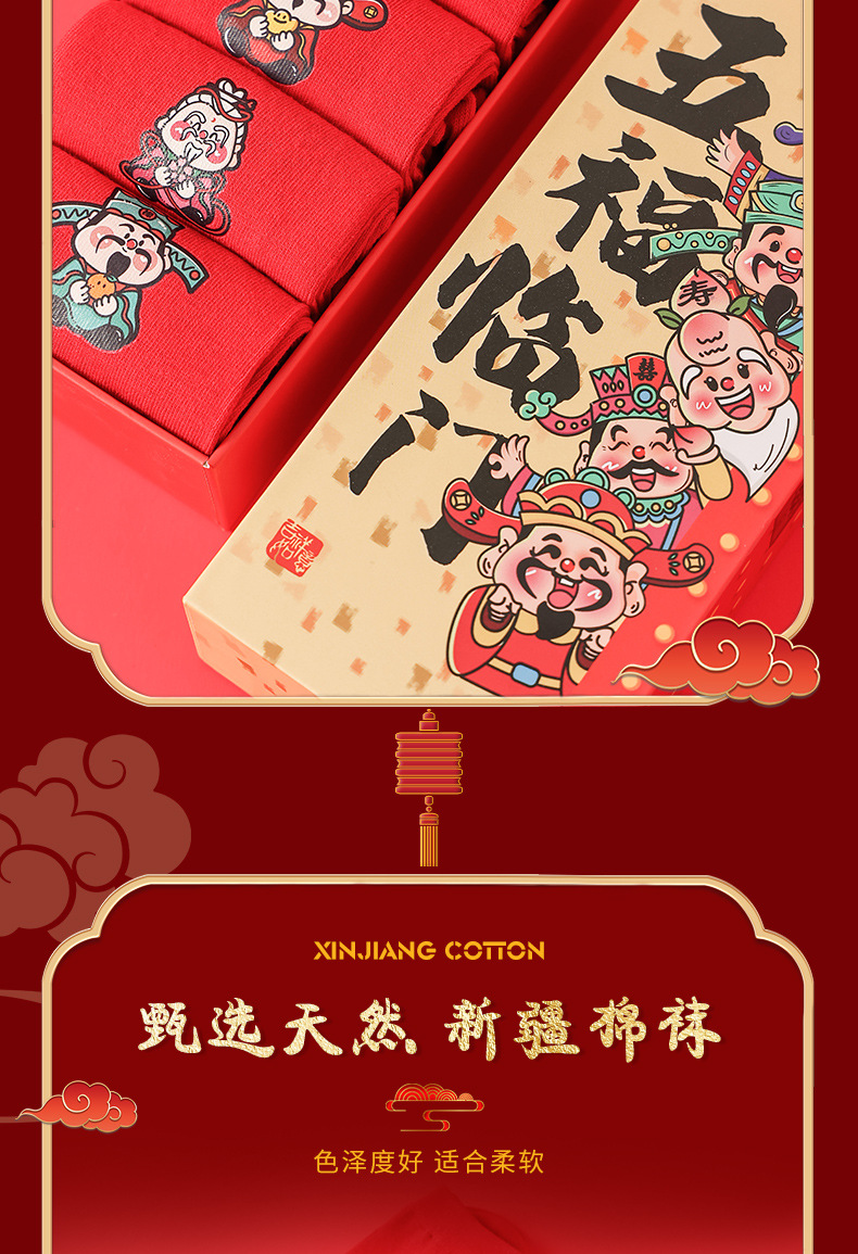 五福临门袜子【龙年刺绣红袜子礼盒装】本命年 男女 双针中筒袜