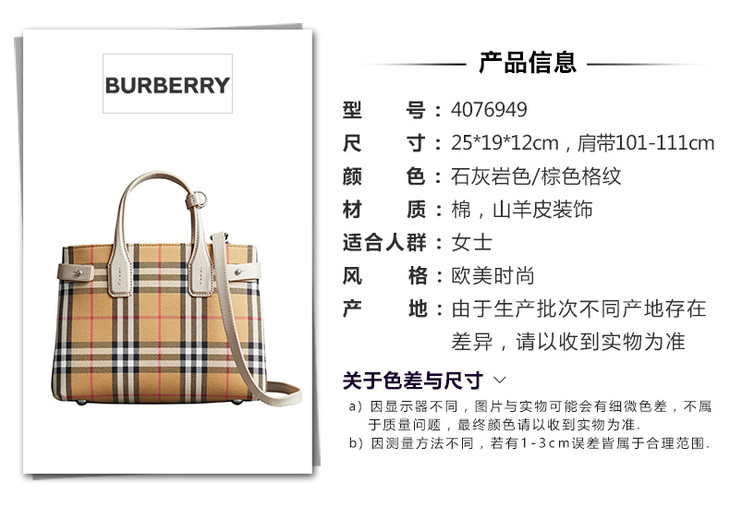 【香港直邮】QH Burberry 巴宝莉 女士经典格纹小号手提包单肩包 4076949