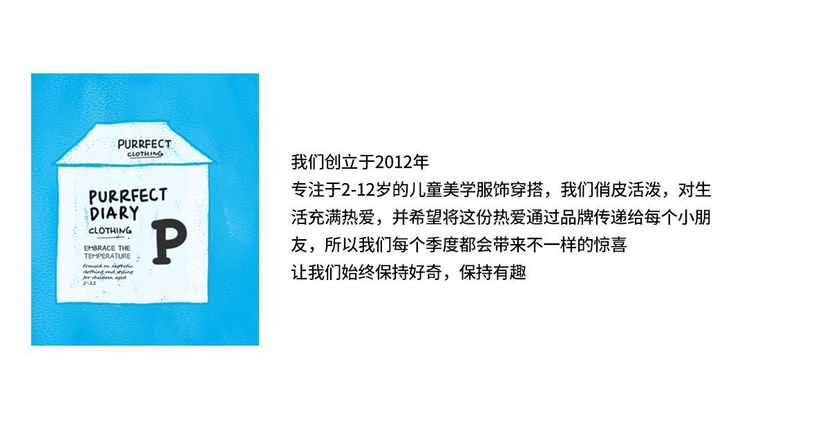 - Purrfect-Diary专注于贴近自然随性的穿着概念,轻奢平价的童装文化传播,在产品设计上更加注重婴童穿着的舒适性、安全性、更出众的国际化品牌,将欧美的育婴文化在中国进行深入的传播与推广。