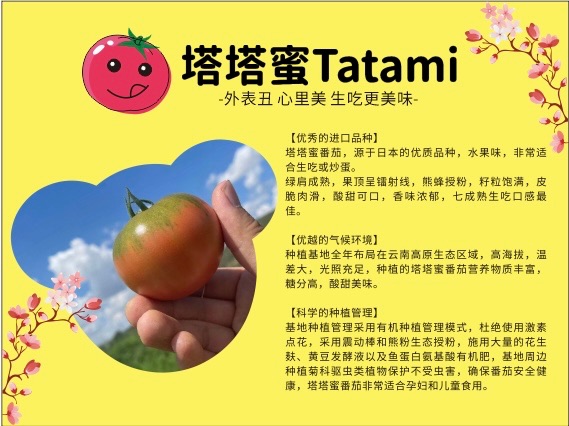基地种植管理采用有机种植管理模式,杜绝使用激素点花,采用震动棒和熊蜂生态授粉,施用大量的花生麸、黄豆发酵液以及鱼蛋白氨基酸有机肥,基地周边种植菊科驱虫类植物保护不受虫害,确保番茄安全健康,塔塔蜜蜜番茄非常适合孕妇和儿童食用。