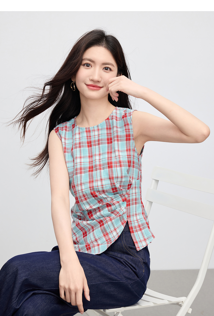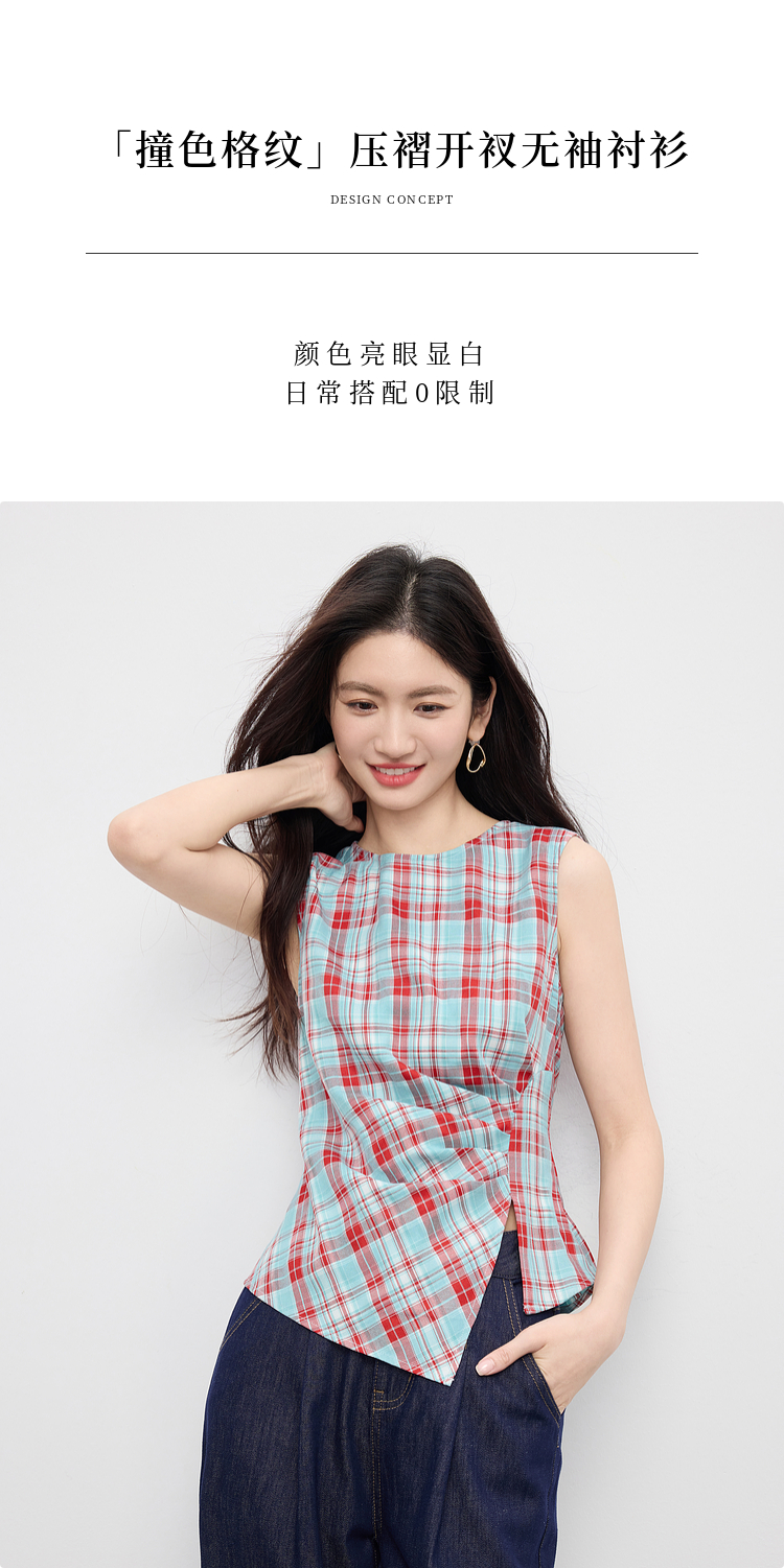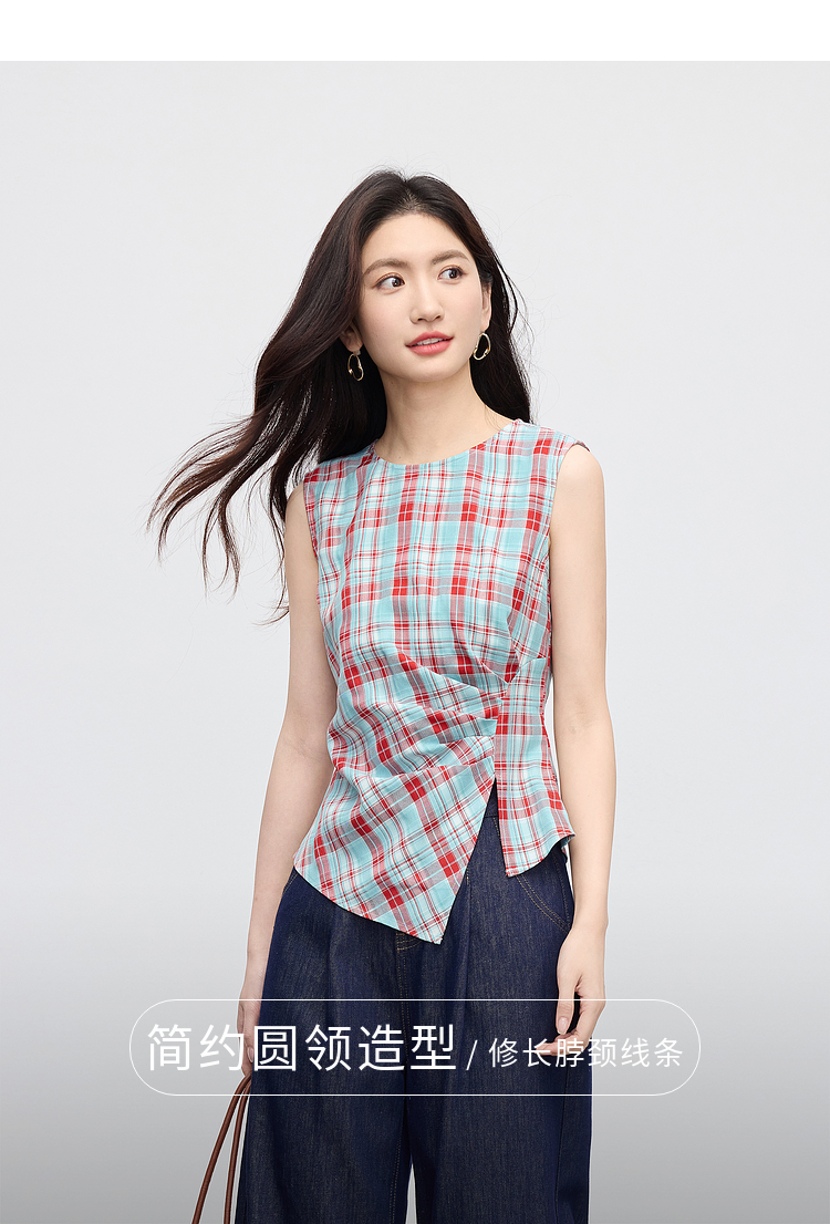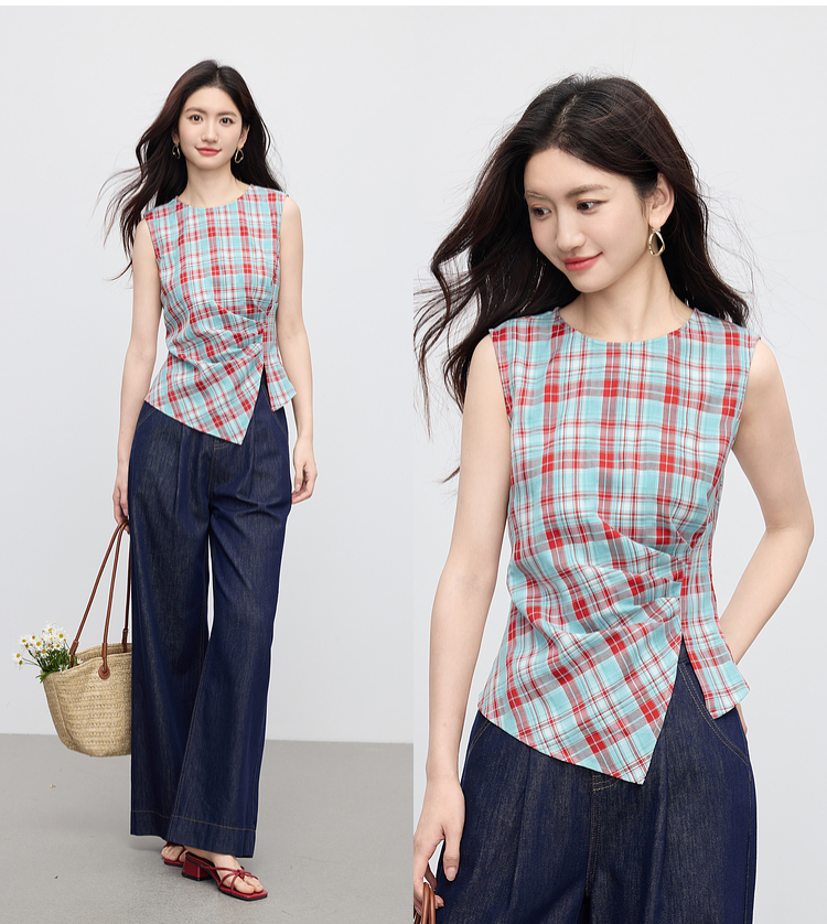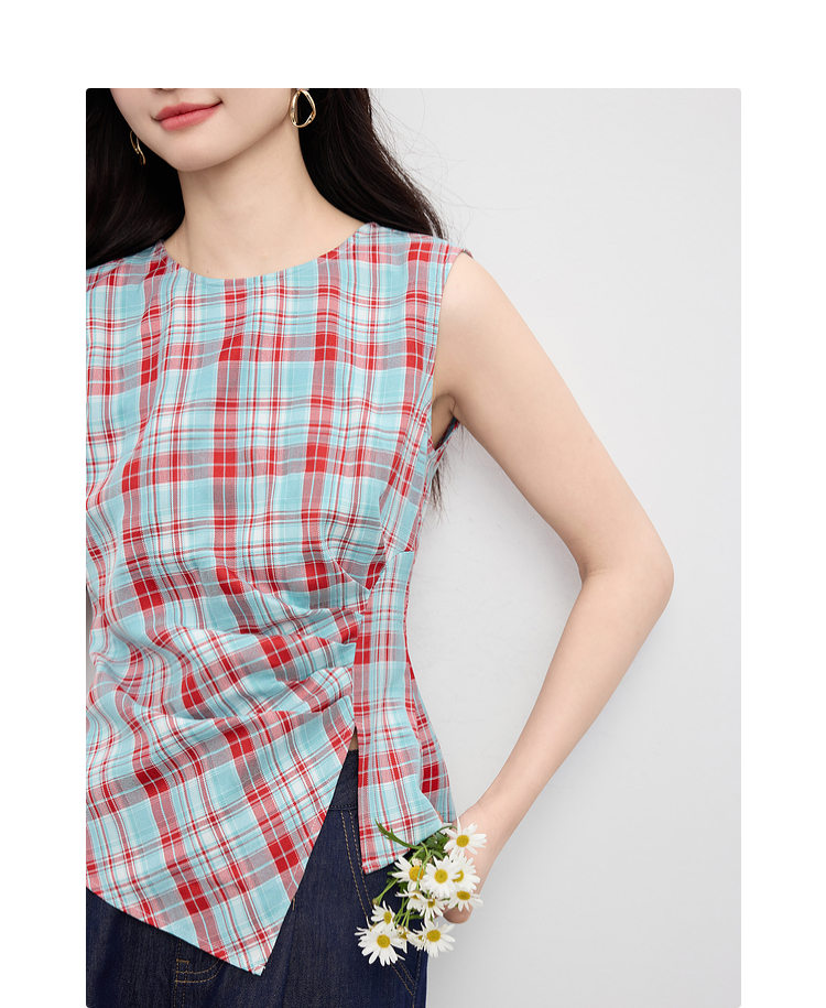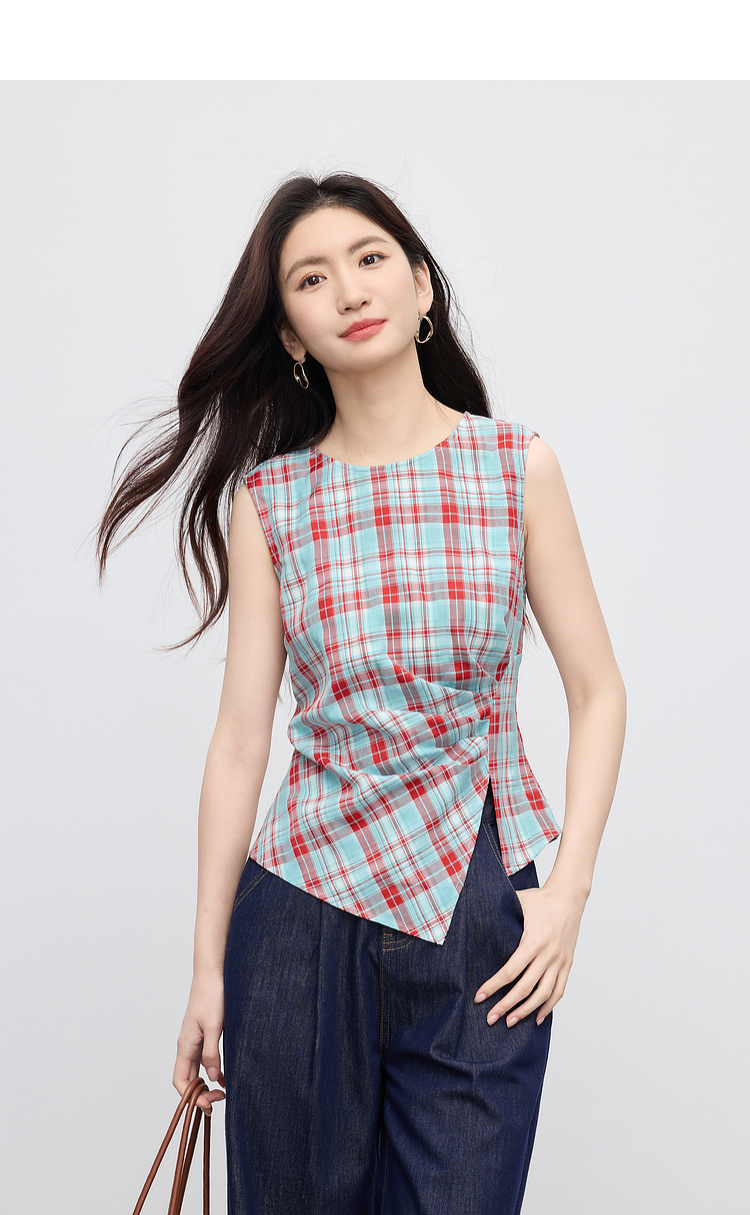 【07/30新品6.5折】熙世界复古红蓝格纹无袖背心女夏季设计感修身不规则褶皱开叉上衣