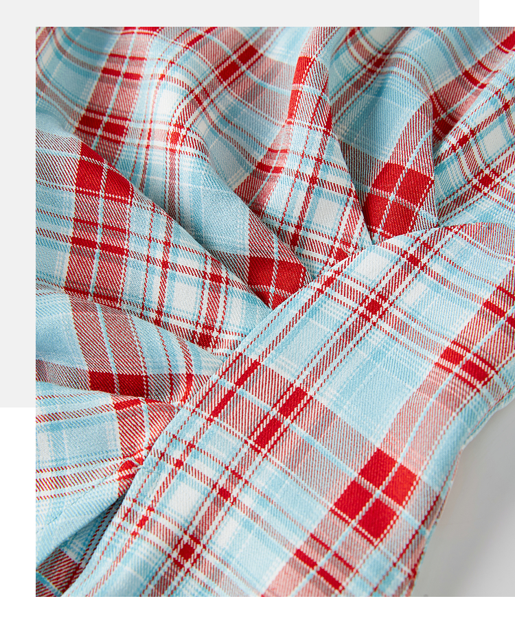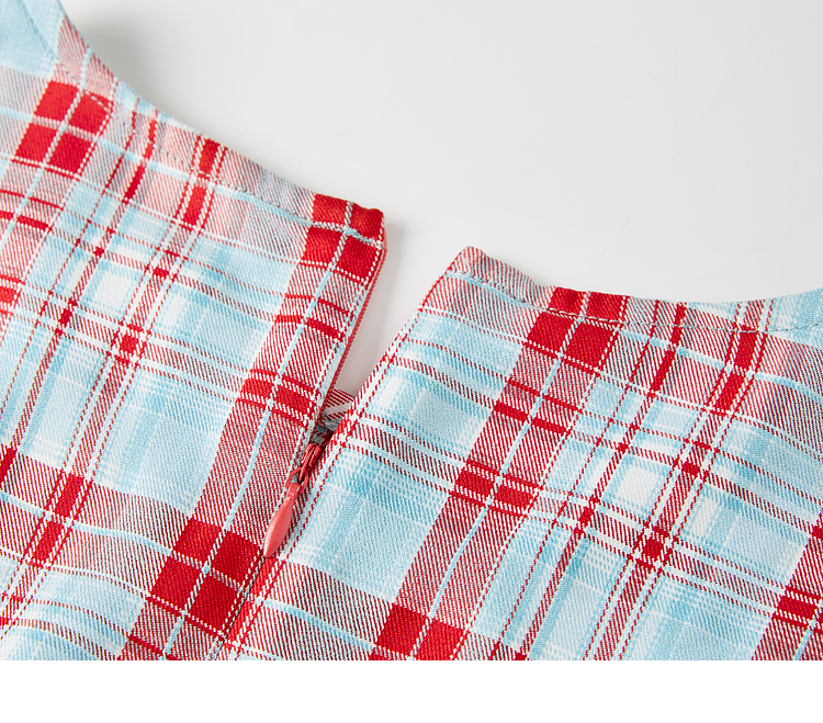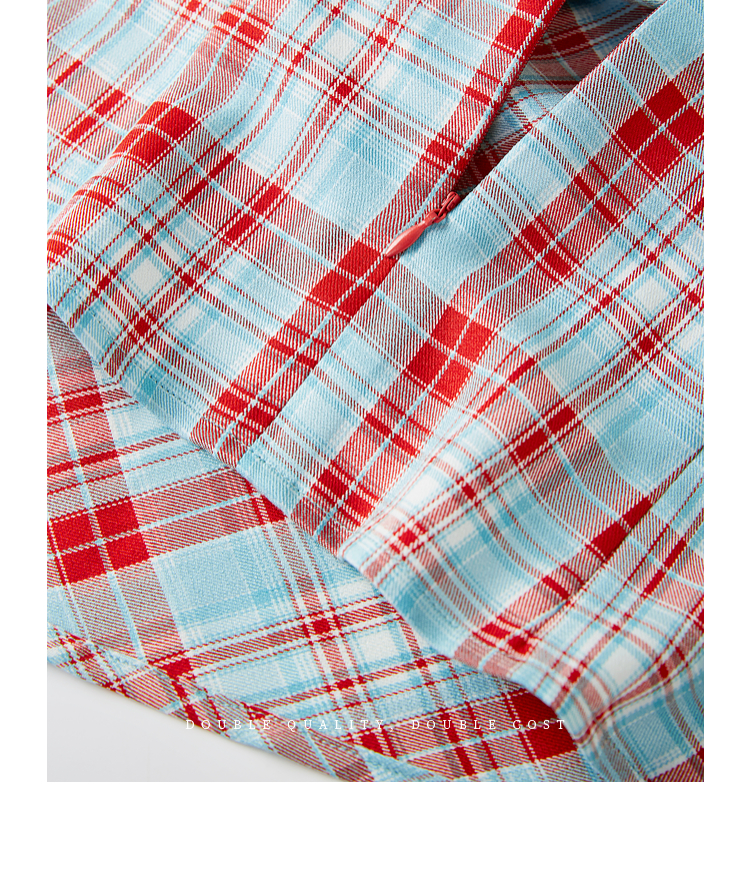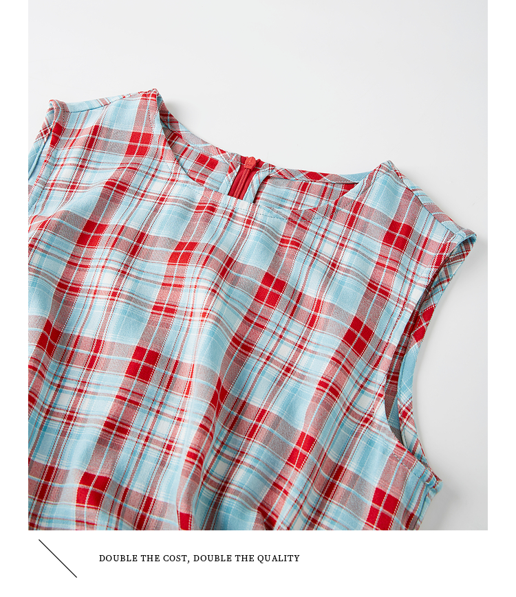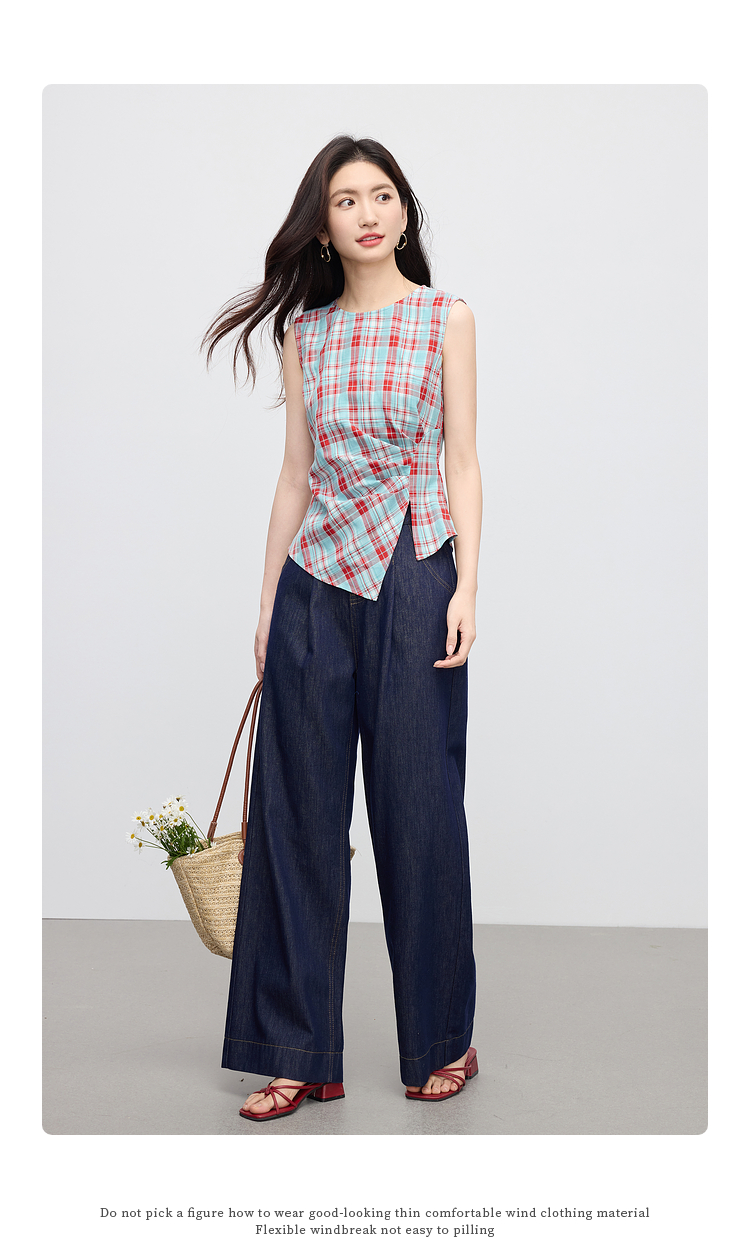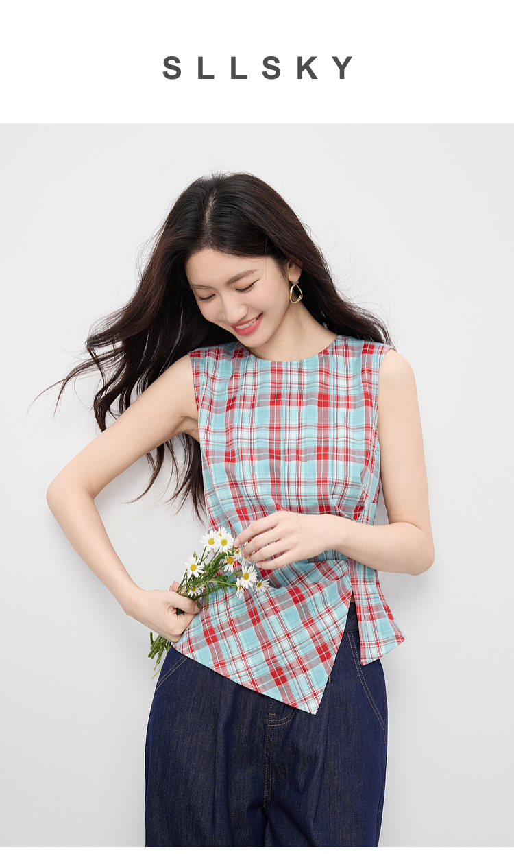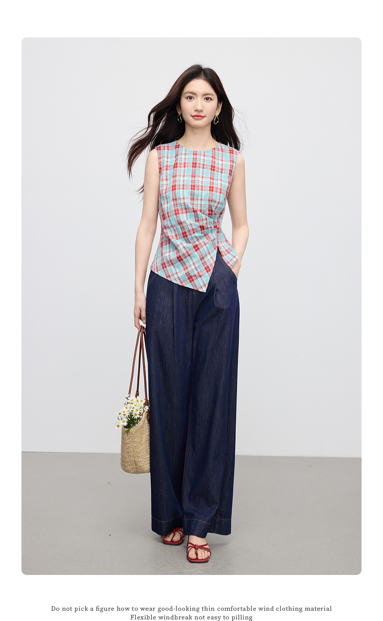 【07/30新品6.5折】熙世界复古红蓝格纹无袖背心女夏季设计感修身不规则褶皱开叉上衣