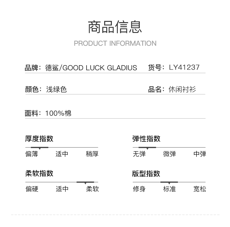 GOOD LUCK GLADIUS品牌由“浙江德鲨服饰有限公司”引进中国市场,经过多年发展,凭借完善的终端形象,规范化的销售管理,迅速赢得消费者的认可,引领国内消费流行,是成功人士首选男装品牌。