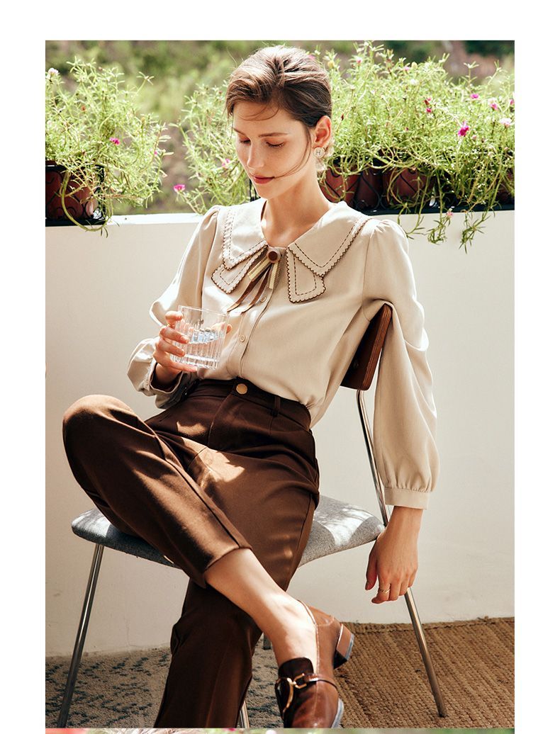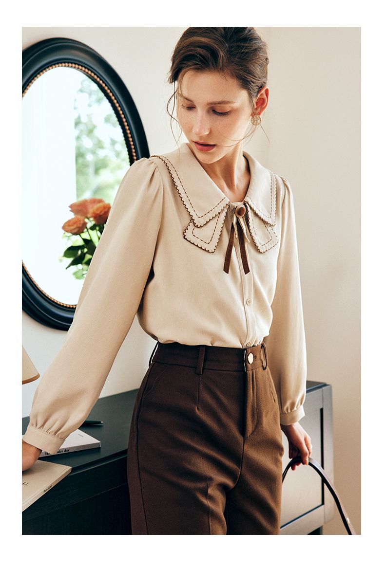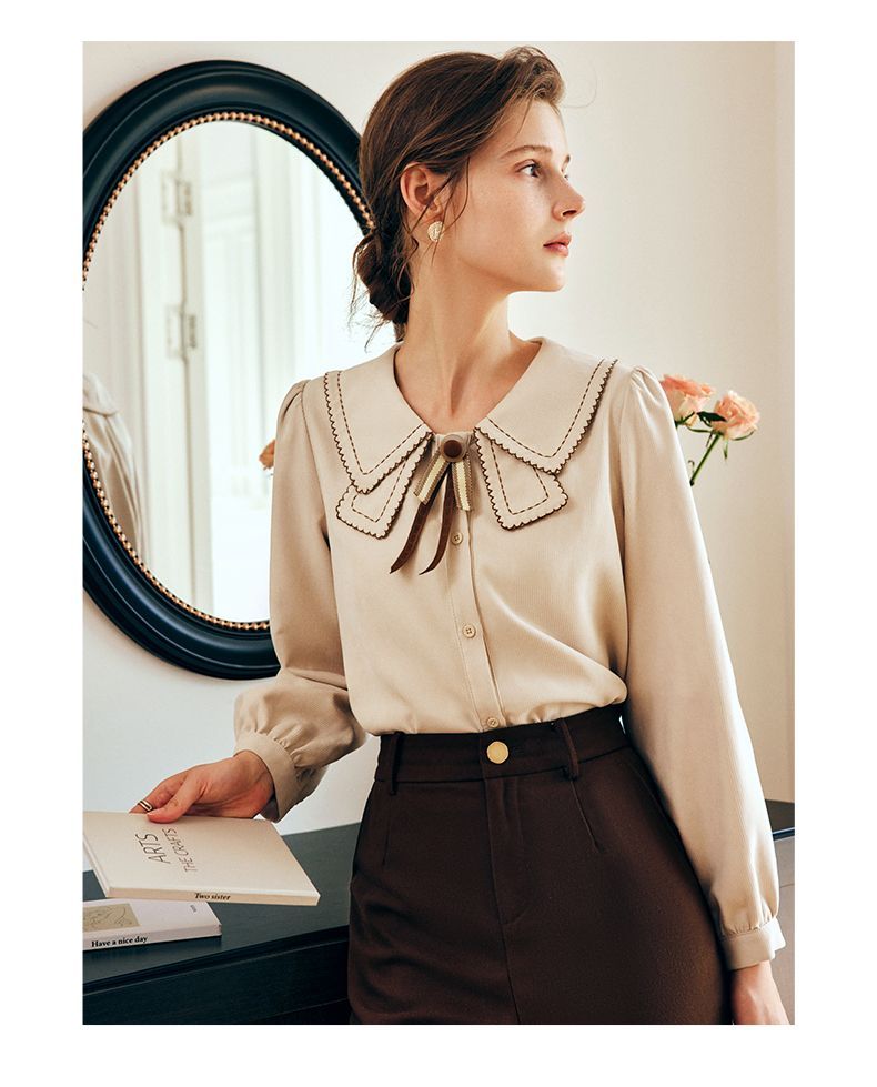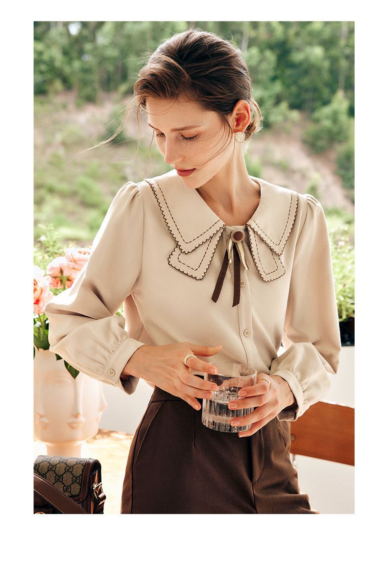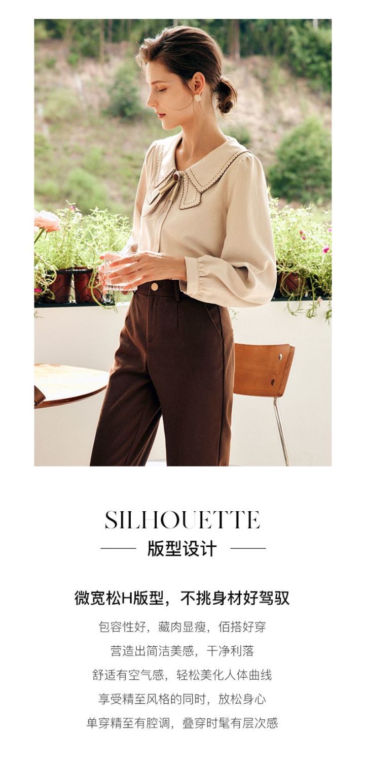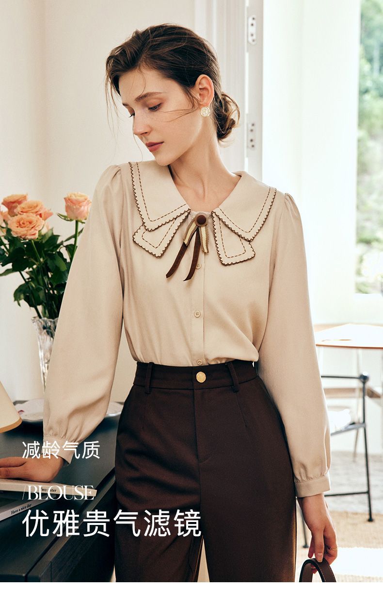 OLrain欧芮儿法式卡其色衬衫女秋季2022年新款洋气蝴蝶结减龄衬衣