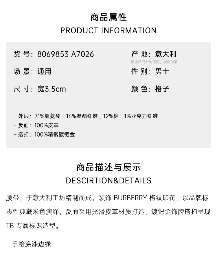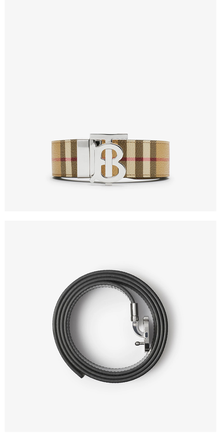 BURBERRY 巴宝莉 男士双面两用格纹拼皮革 TB 腰带 格子 8069853 A7026