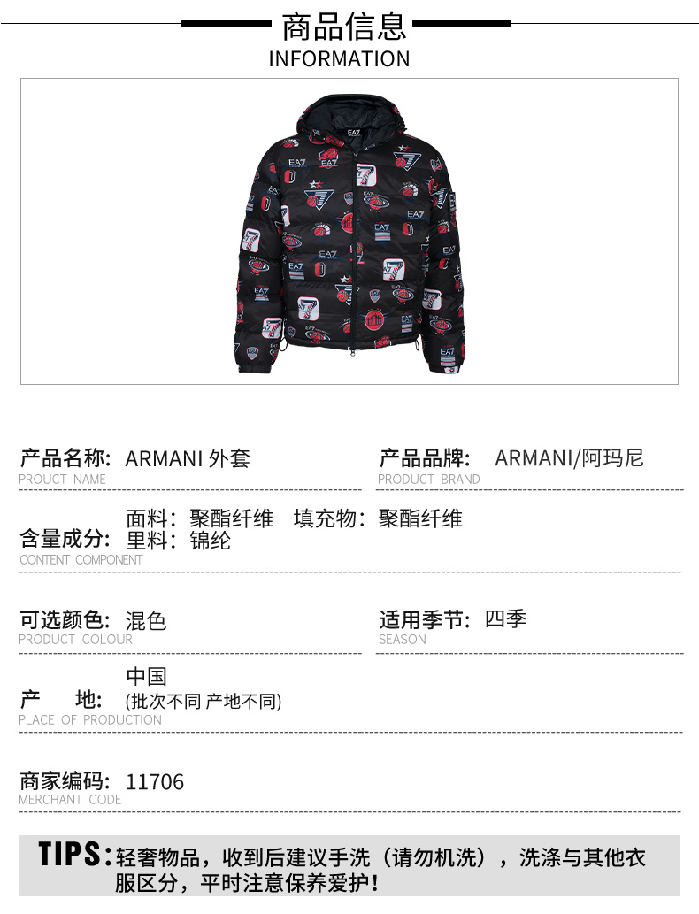 【超惠秒】Armani EA7 男士百搭潮流运动休闲保暖夹克棉服11706