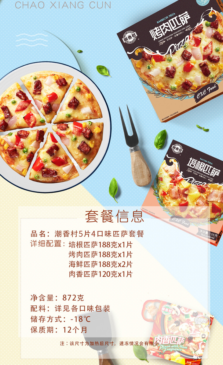 潮香村披萨 培根188g*1+188g*1+海烤肉鲜188g*2+肉香120g*1(5片装)