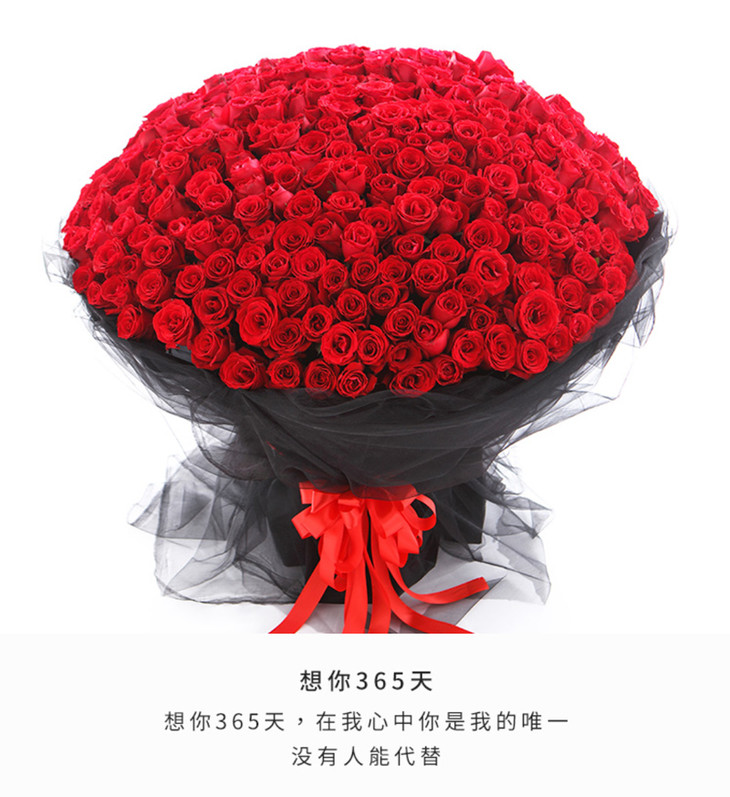 想你的365天----365朵玫瑰(红、粉、白颜色可选)。 米黄色网纱围绕,粉色米黄色双色缎带花结(1103)