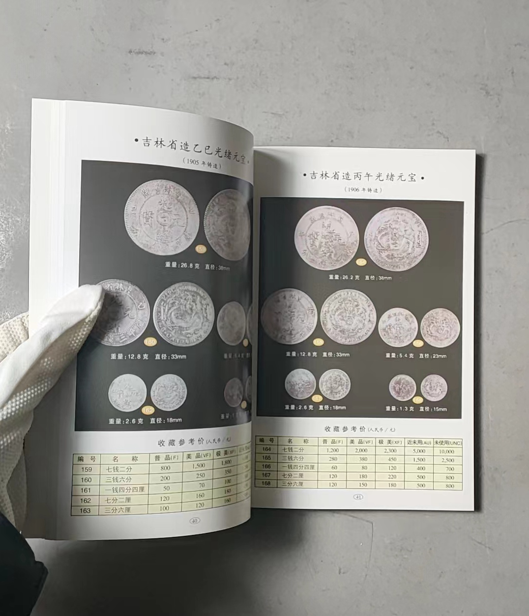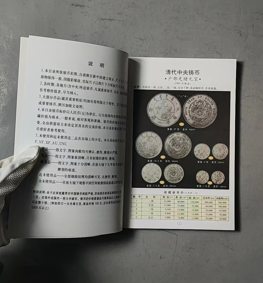 本目录所收银币彩图,自清朝至新中国建立前止,尺寸大小基本与原物保持一致,因摄影缘故,实际尺寸图片下方所标尺寸为准。各时期,各地方所造银币,凡属重要铸币、名珍、稀贵版别及有考察价值者,尽当纳入。大部分币品均加有简明版注于图旁。若干稀贵品种或重要铸币,则另加批文说明。本目录银币标价以人民币(元)为单元。以目前国内实情和其本身收藏价值为根本,一般来说,相对客观和准确。银币的价格并非固定不变,全由供需双方来决定其真实的交易价格,本目录价格仅供广大钱币爱好者参考使用。