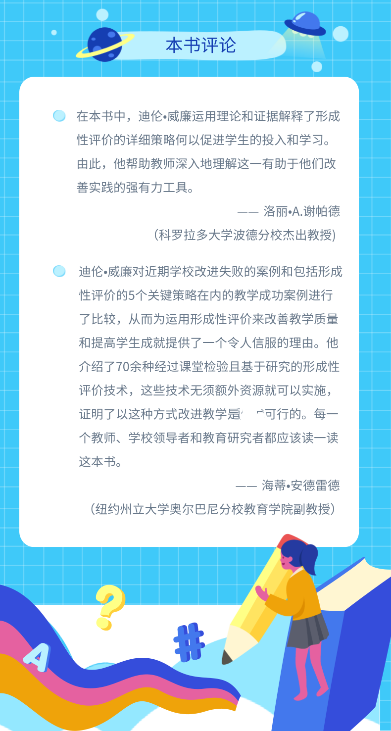 本书作者迪伦·威廉提出,教育水平对个体和社会的发展有着巨大的影响,而提升教育水平,关键在教师。每个教师都能在课堂上做出改变,以提升教学质量,这比学校改革和课程改革更有效果。在课堂教学中融入形成性评价,就是提升教学质量有效的方法。在书中,作者采用理论与实践相结合的方式,介绍了形成性评价的5个关键策略,并提供了70多种课堂形成性评价的实用技术。这些在普通课堂就可实施,无需额外的资源,可以帮助教师改进教学实践,提升学生的学习成果。