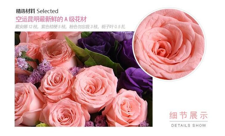戴安娜12枝,紫色桔梗5枝,粉色勿忘我3枝,栀子叶0.5扎