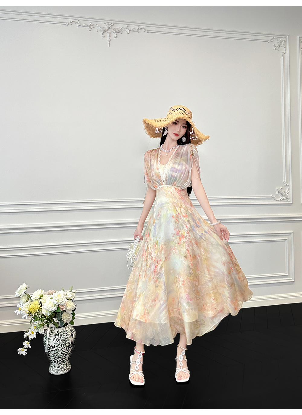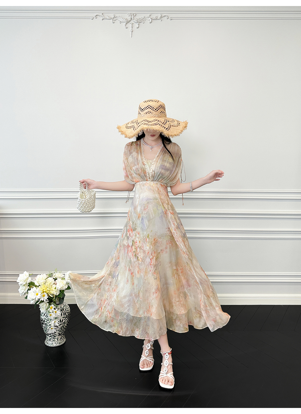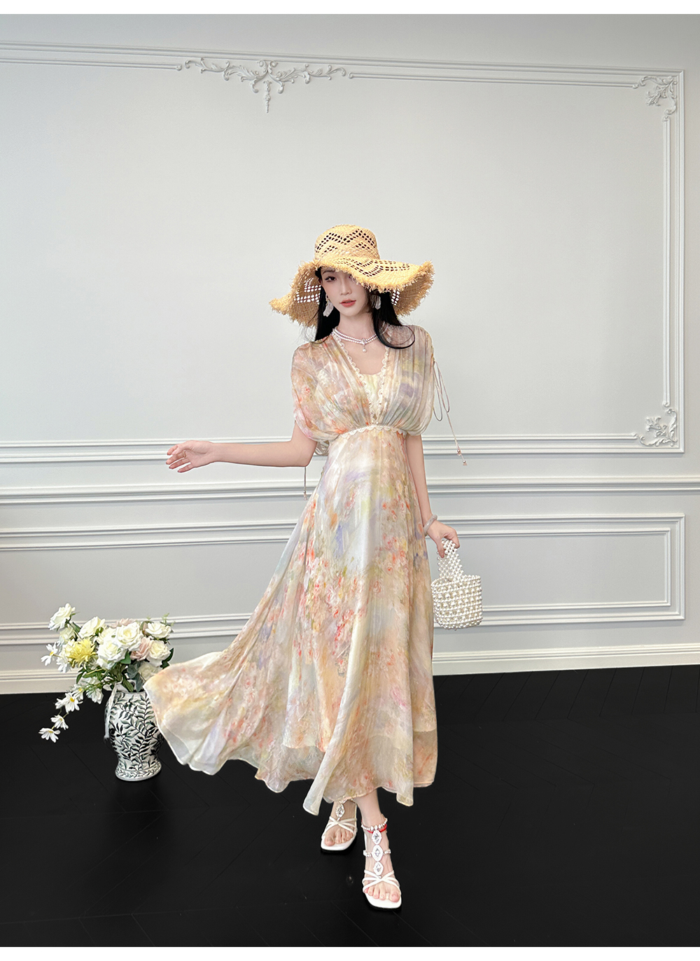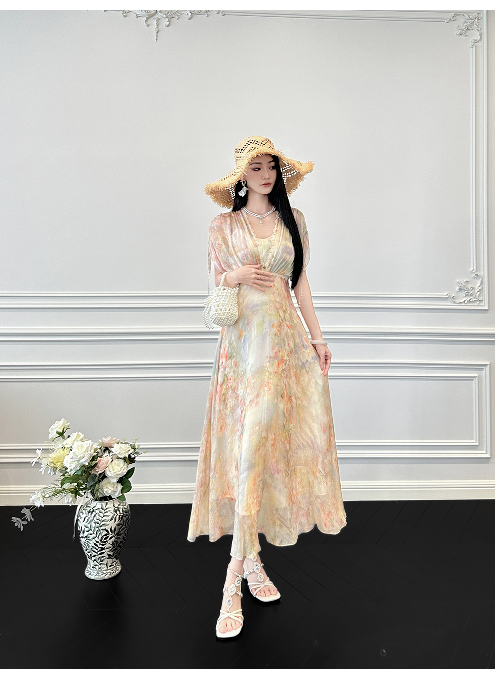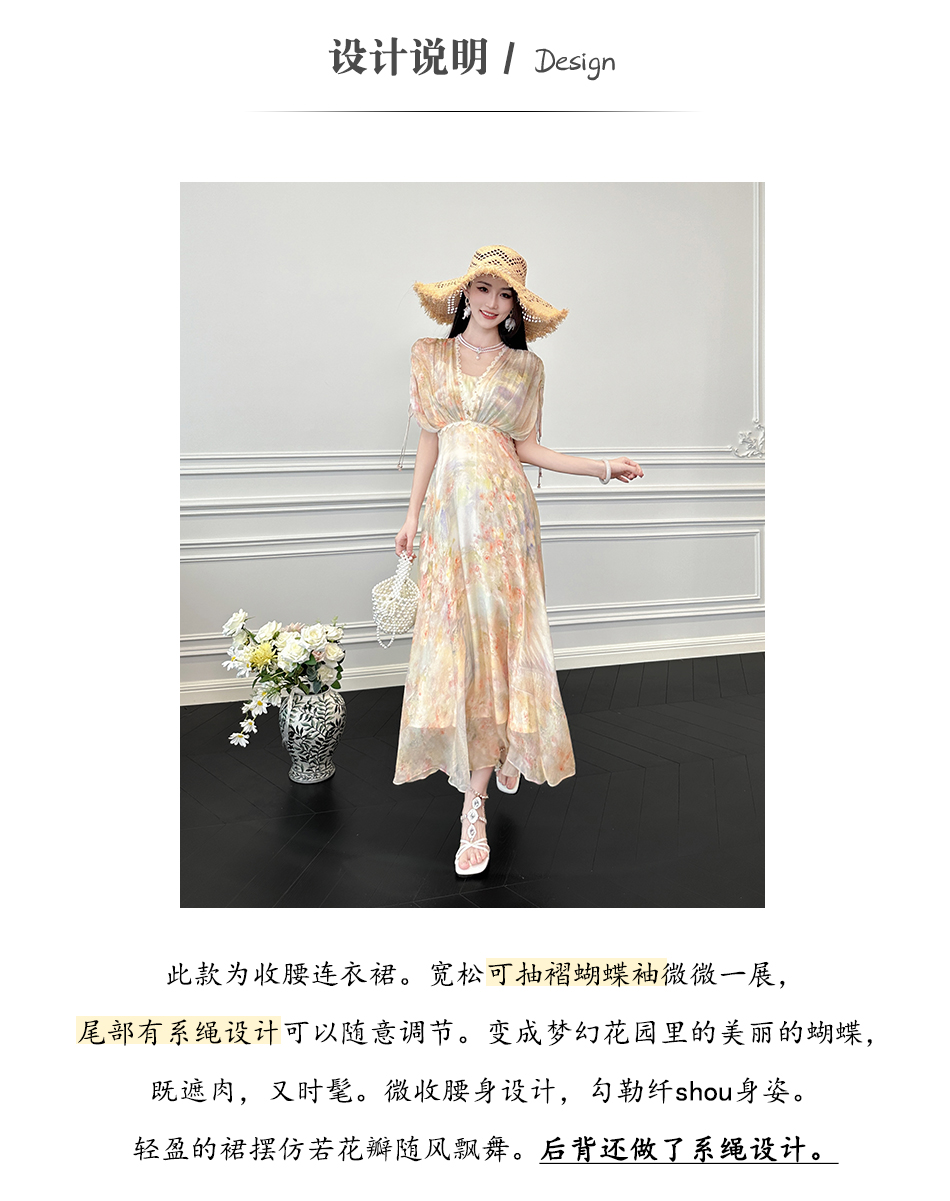 【孤品样衣,不退不换】 【罗马玫瑰】轻奢真丝宽松抽褶蝴蝶袖气质收腰连衣裙