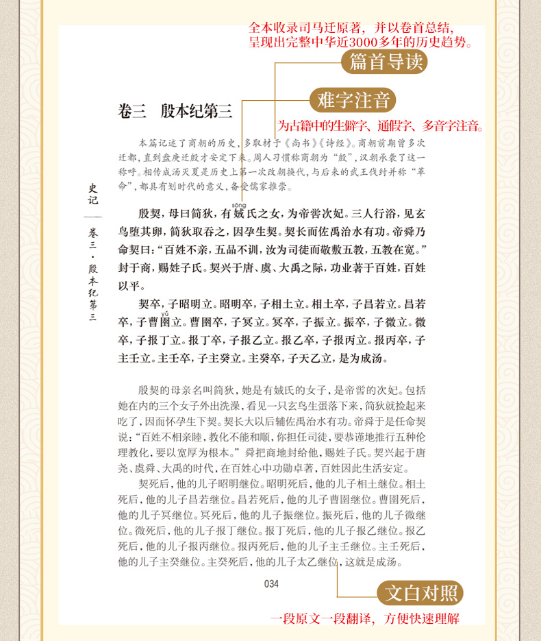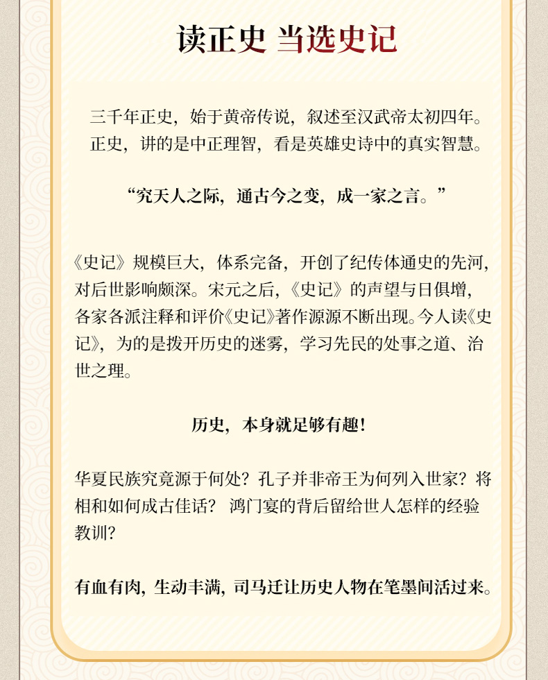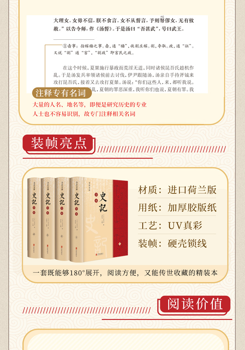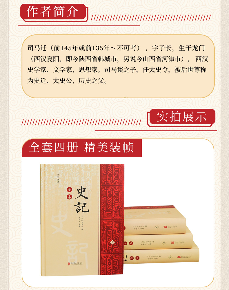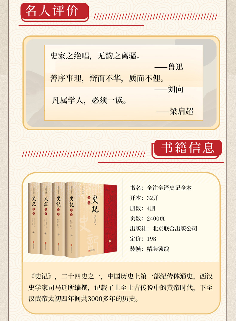 《史记》是中国第一部纪传体通史,作者司马迁从传说中的黄帝开始,一直写到汉武帝元狩元年(前122年),叙述了我国三千年左右的历史。全书包括本纪十二篇,表十篇,书八篇,世家三十篇,列传七十篇,凡一百三十篇。不仅记述了各阶层重要历史人物的事迹和重要历史事件,而且涉及礼乐制度、天文兵律、社会经济、河渠地理等诸方面的重要论述。《全注全译史记全本(共4册)》是《史记》的注译全本,由李翰文主编。