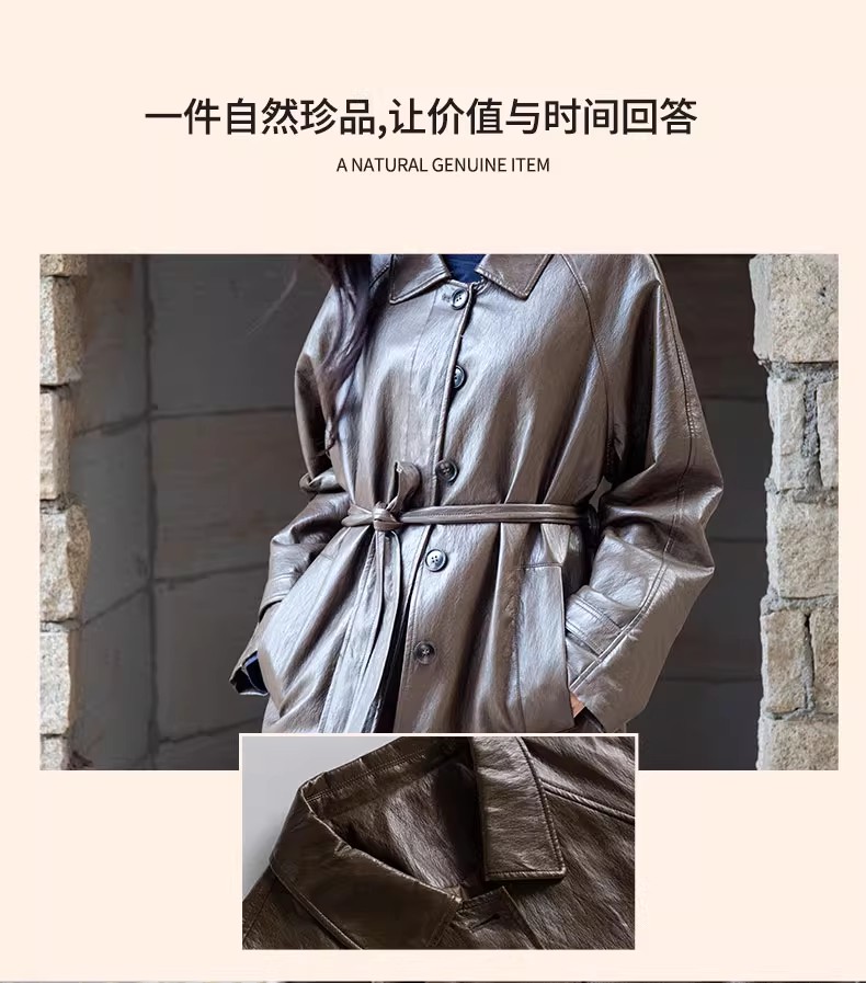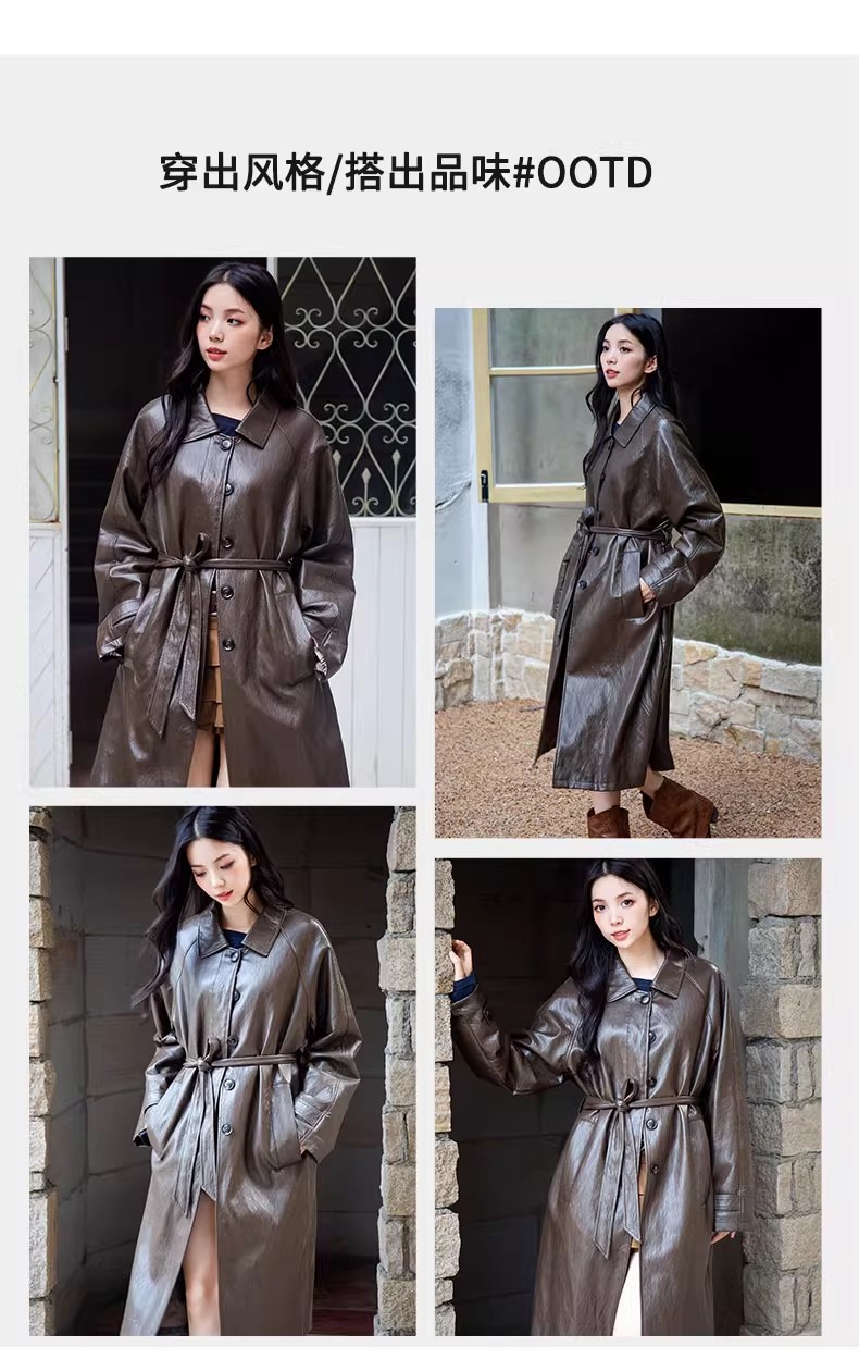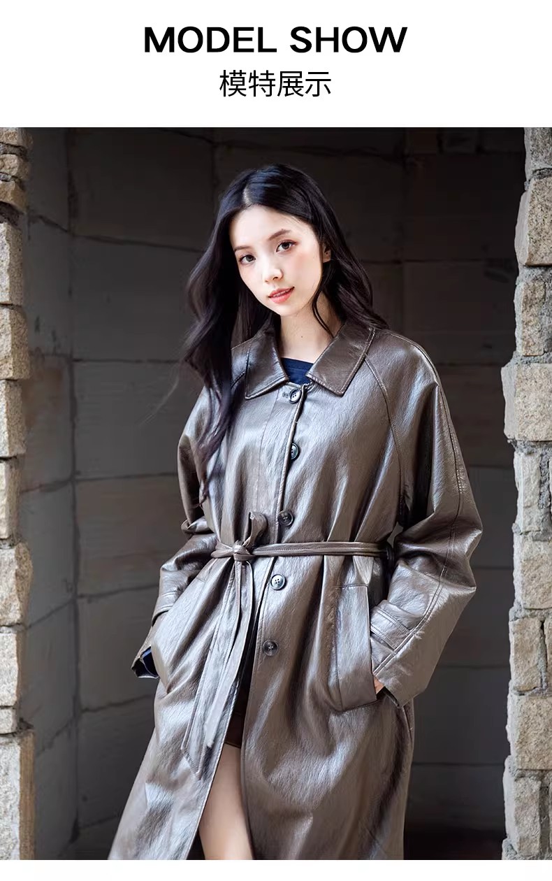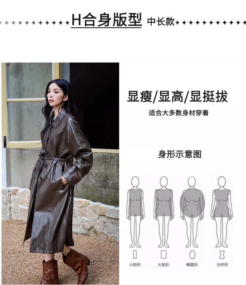 【门店同款】ENJOY秋季“浮光织影”翻袖条纹长款皮衣 164250153