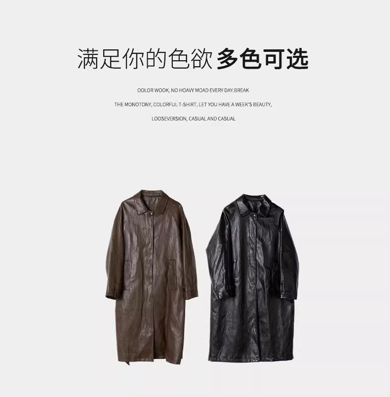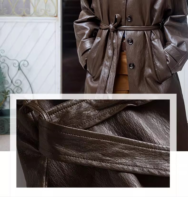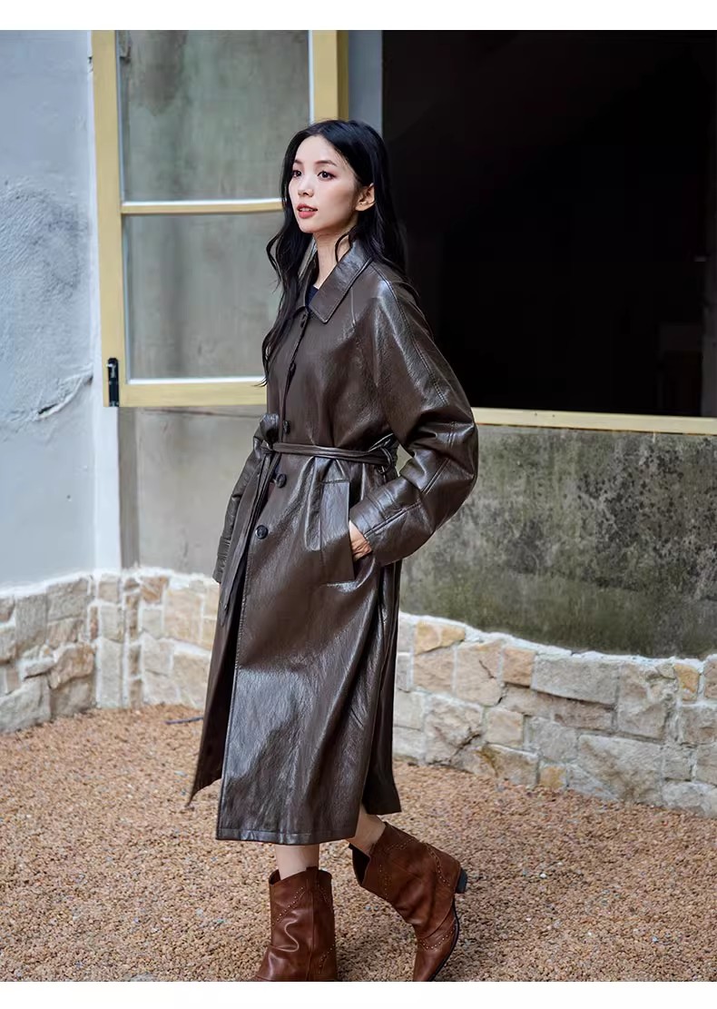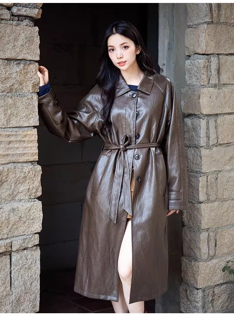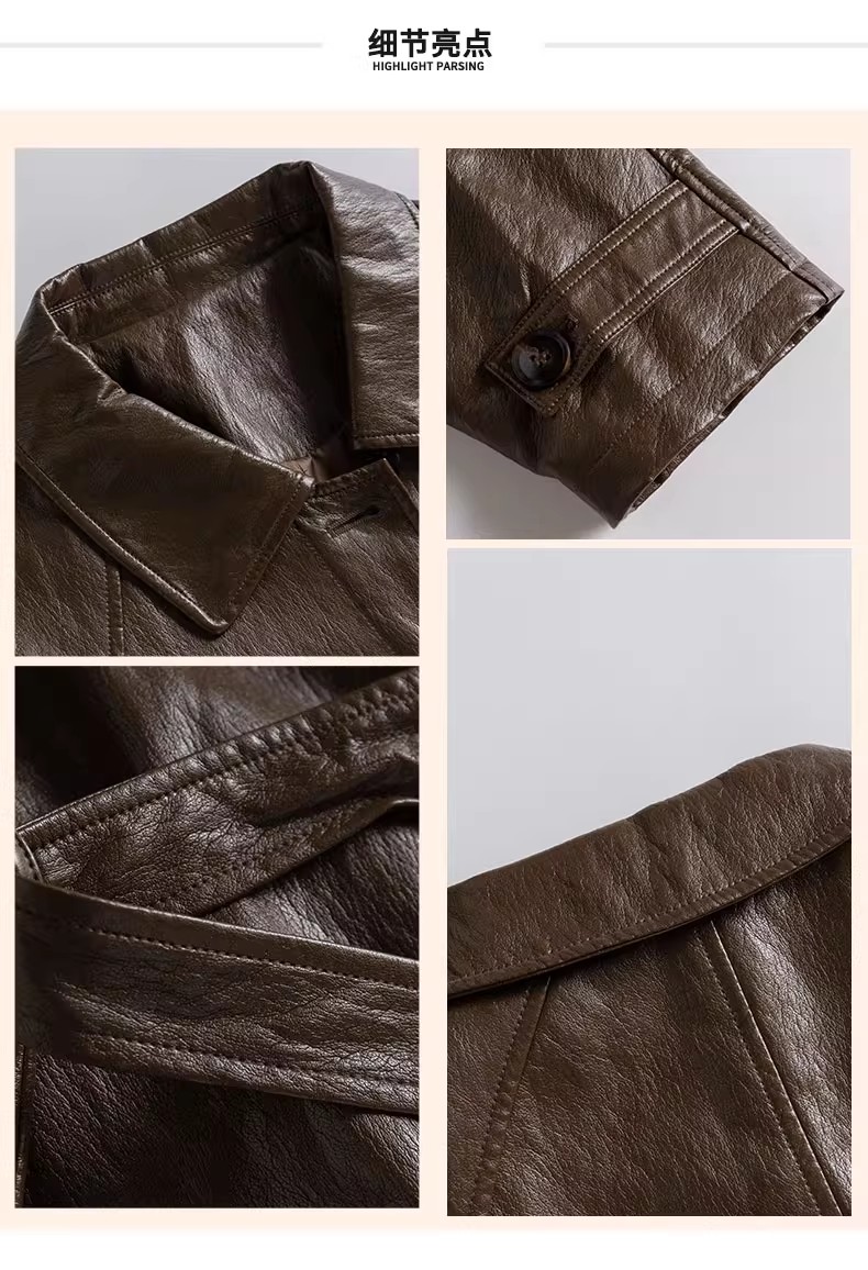 【门店同款】ENJOY秋季“浮光织影”翻袖条纹长款皮衣 164250153