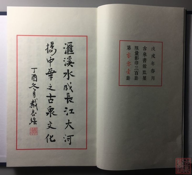 装帧:纯手工装订。内文用安徽手工加厚单宣双色印刷,筒页中间衬单页,封面为传统瓷青纸,函套为传统兰布套,签条为仿古晒金宣。六眼线装。