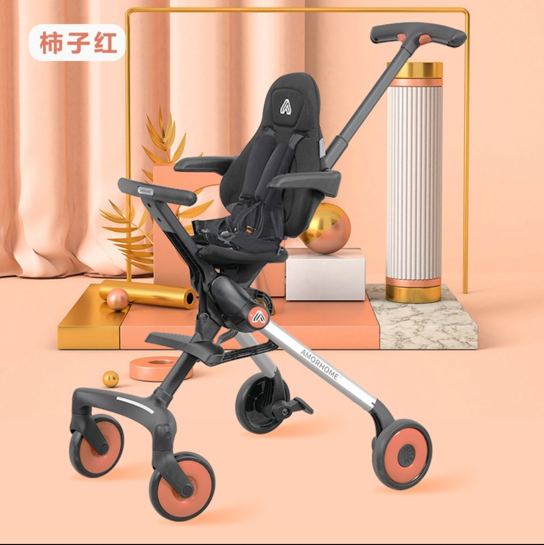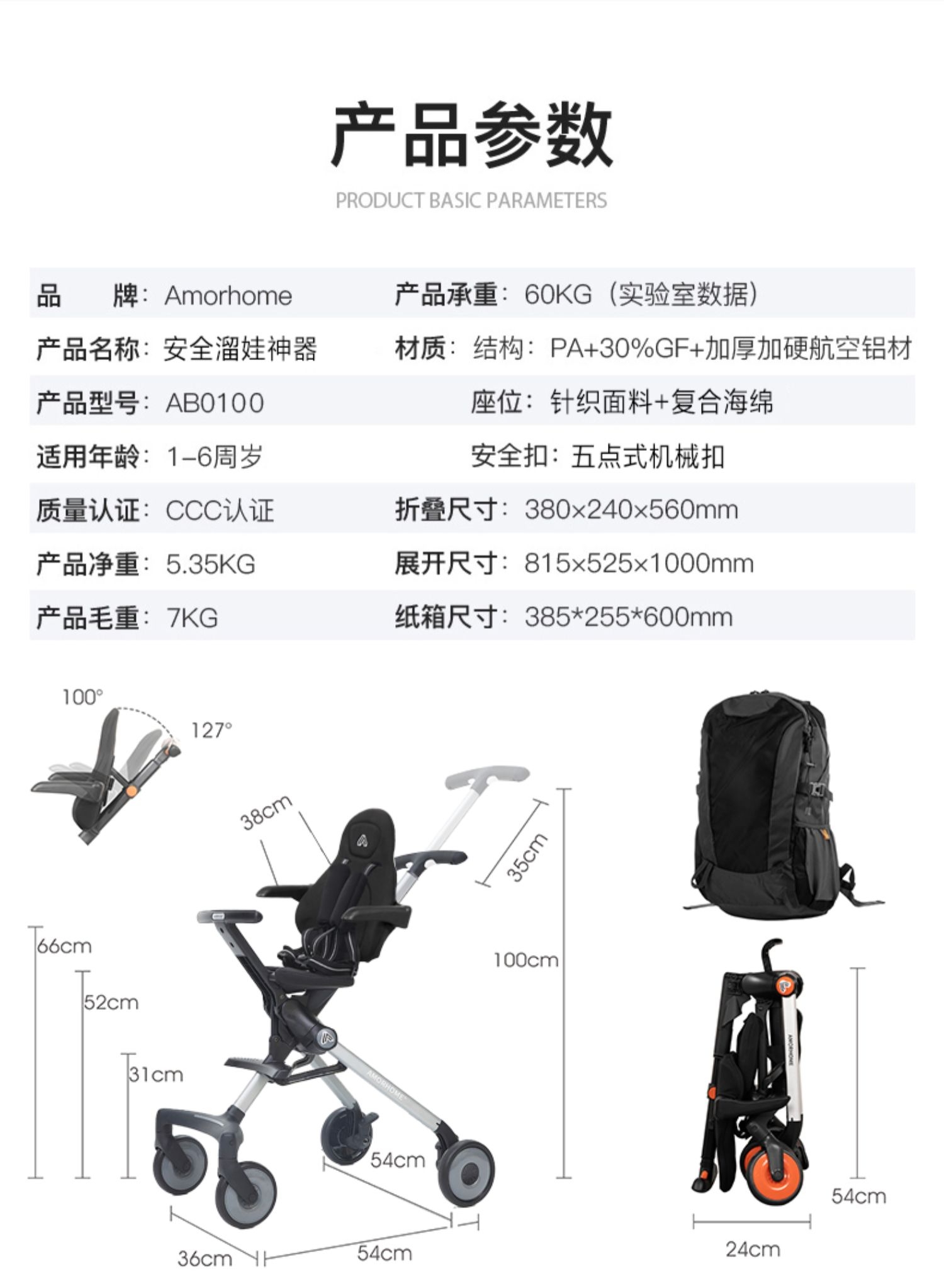 AMORHOME溜娃神器可坐可斜躺的婴儿遛娃车,适用年龄:1-6周岁 五点式机械扣 3c认证 (再赠送遮阳伞一把)