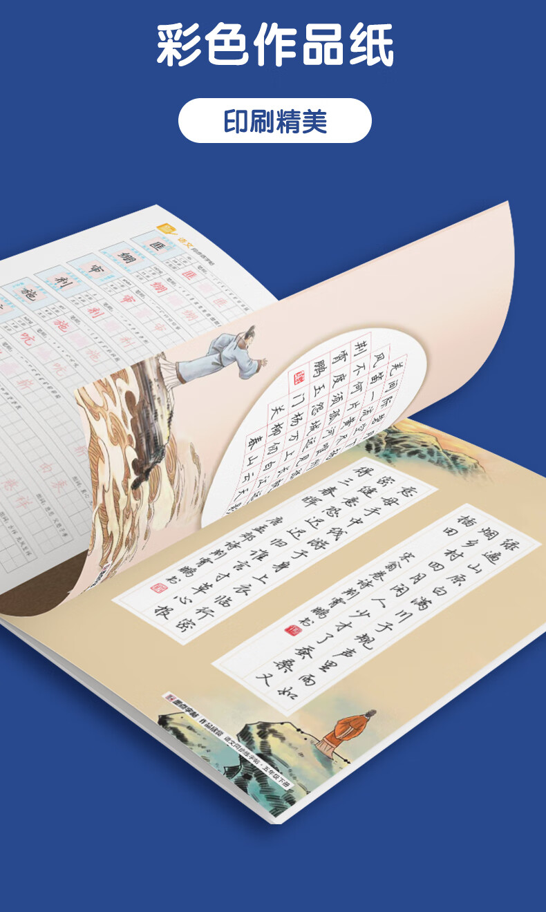 作品欣赏:精心设计彩色作品页,编人课本中要求掌握和课外需要了解的重点古诗,以书法作品的形式展现,附有黑字的作品页可供欣赏,空白作品页供你们进行创作,整体美观且便于展示。