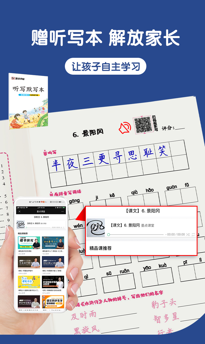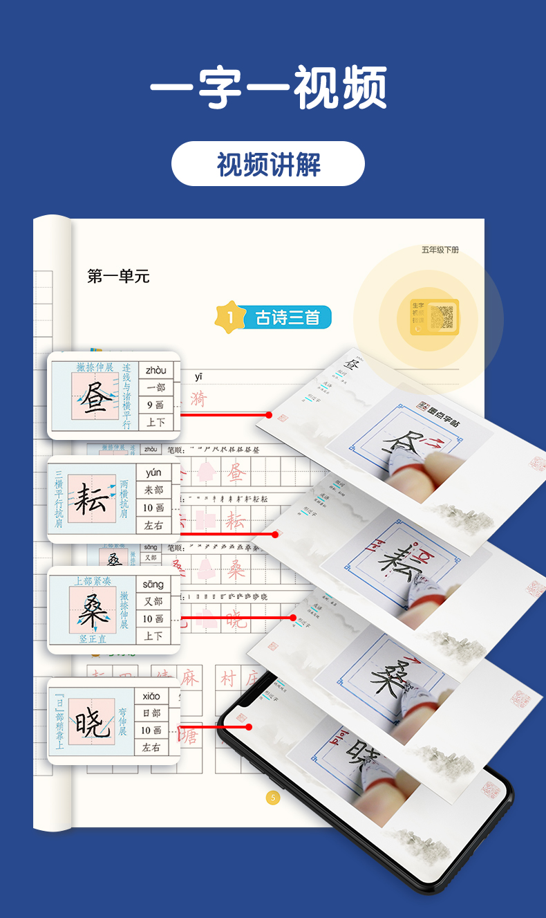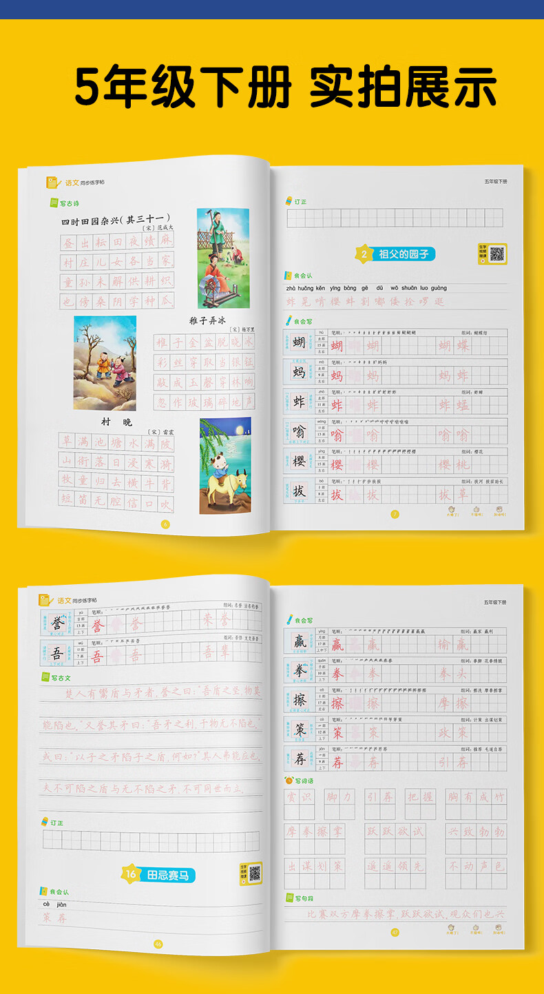 写诗词:编人课文中的必背古诗词,增加描红空间并配有趣味性插图,在练字的同时巩固记忆重点古诗。