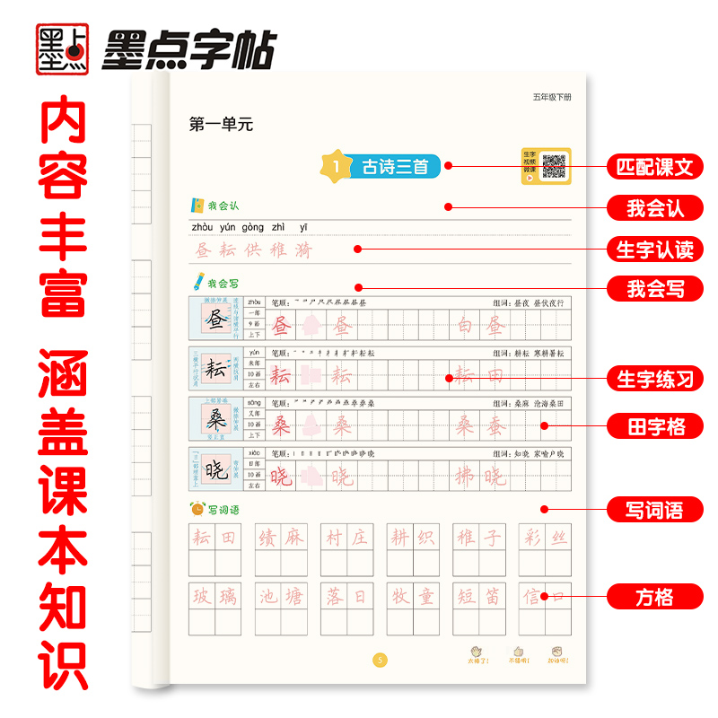 《墨点字帖·小学语文同步练字帖》系列丛书栏目和功能:
