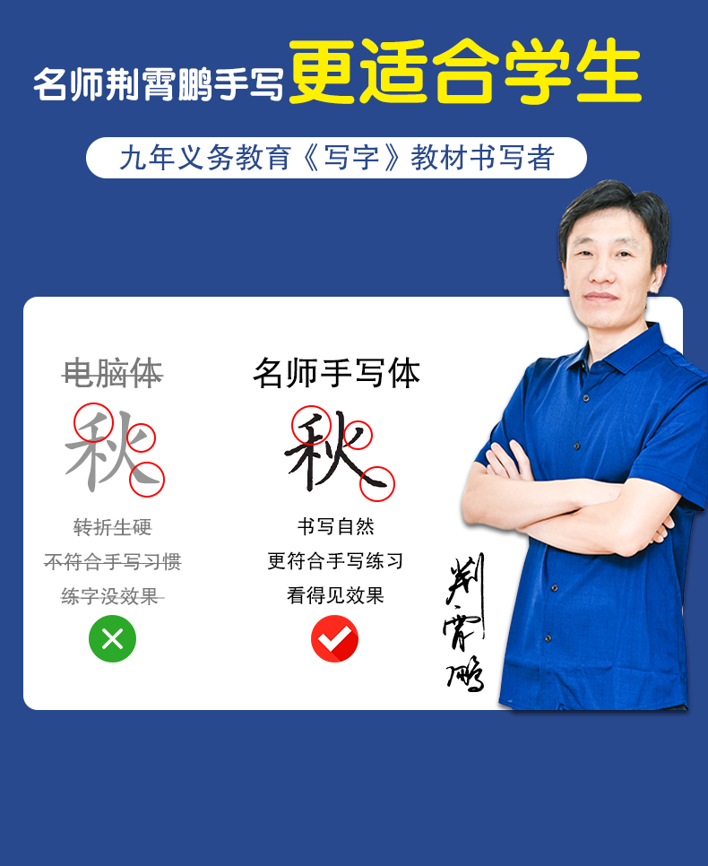 荆霄鹏,教育部审定《书法练习指导》教材副主编,九年义务教育《写字》教材书写者,高校书法教材范字书写者,“中国硬笔书坛百杰”,“二十年中国硬坛百家”,多次担任全国硬笔书法赛事评委,曾任清华大学美术学院特聘书法教师,全国硬笔书法骨干教师高级研修班主讲,全国欧体书法命题联展首位获得者,书法专业报刊连载讲座特邀作者,出版各类书法字帖800余种。
