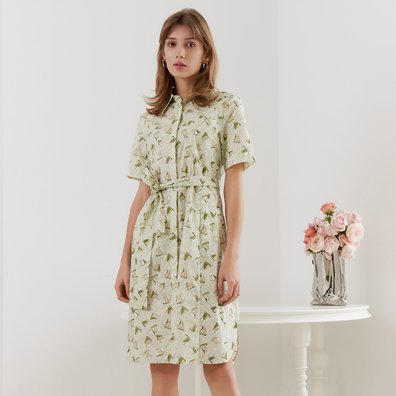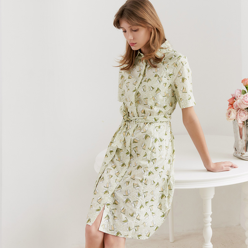 【100棉系带衬衫裙】23年春夏新品女士纯棉连衣裙时尚印花系带收腰裙子